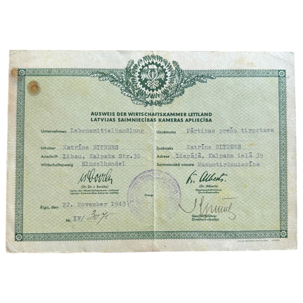 Deze originele Ausweis der Wirtschaftskammer Lettland (economische kamer legitimatie) is een Duits-Letse bedrijfs- en handelsvergunning uit de Tweede Wereldoorlog, afgegeven op naam van Katrine Bitners, eigenaresse van een Lebensmittelhandlung (levensmiddelenhandel). Het document vermeldt als vestigingsadres Libau, Kalpaka Str. 39 (het huidige Liepāja, Kalpaka iela 39, Letland) en geeft aan dat het bedrijf actief was in de detailhandel.