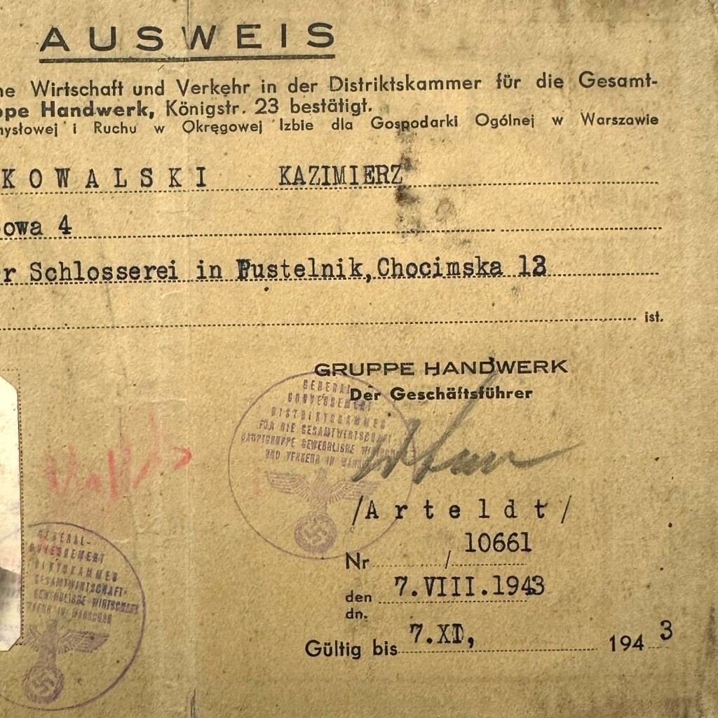 This original Ausweis issued by the Hauptgruppe Gewerbliche Wirtschaft und Verkehr – Gruppe Handwerk in Warsaw is a German occupation-era craft identification document, issued in the name of Kazimierz Kowalski. The card confirms that he resided at Pustelnik, Lipowa 4 and was co-owner of a locksmith’s workshop (Schlosserei) in Pustelnik, ul. Chocimska 18. The document was issued by the authority located at Königstraße 23 in Warsaw and is dated 7 August 1943, with multiple extension stamps through 1944. The Ausweis includes an original passport photograph, handwritten personal details, signatures, and various official stamps from the German occupation authorities.