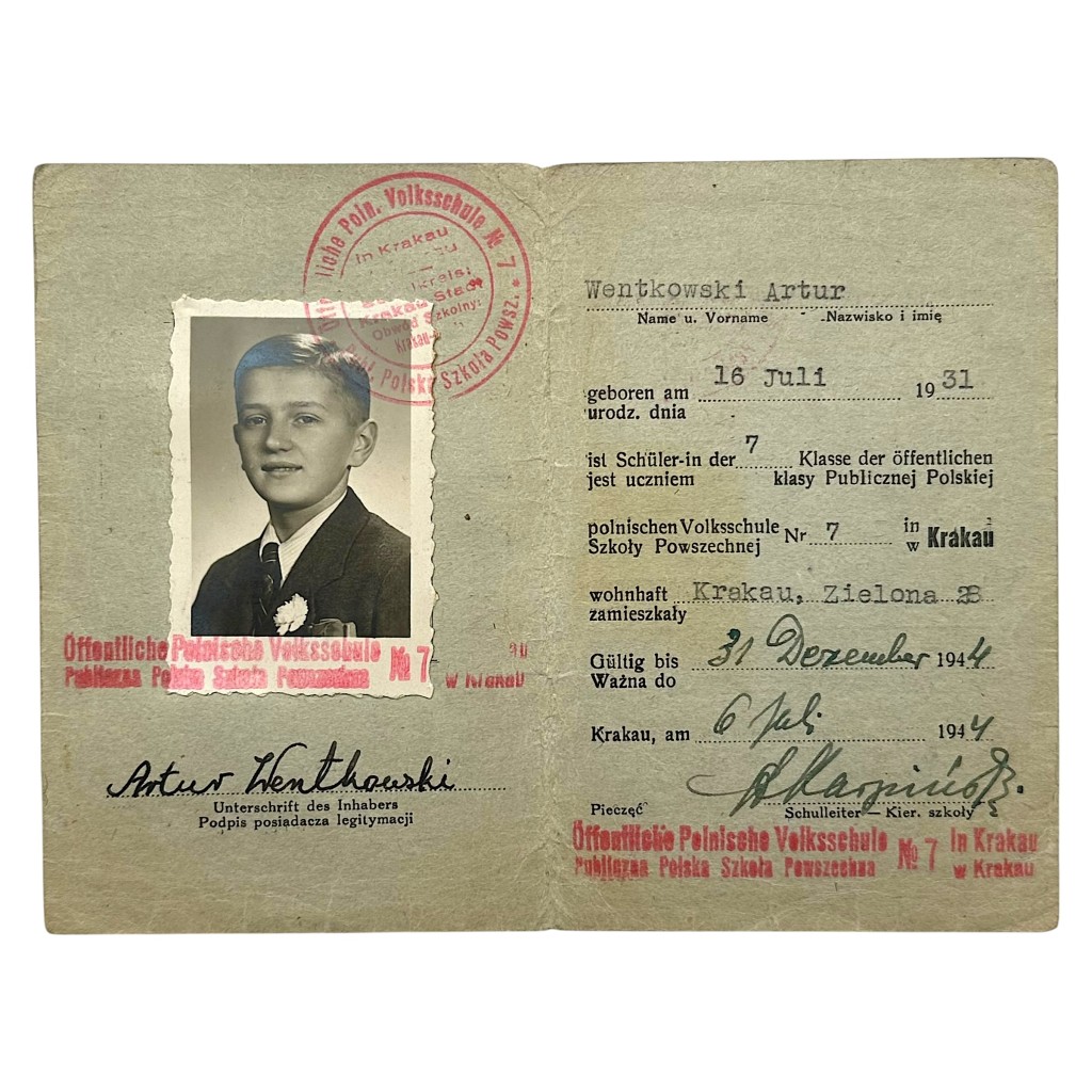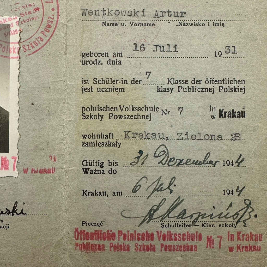 The identification card is issued in the name of Artur Wentkowski, born on July 16, 1931, a pupil in the 7th grade, residing at Zielona 23, Krakow. The document was issued on July 6, 1944, and was valid until December 31, 1944, with a later extension into 1945.