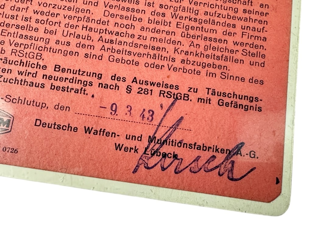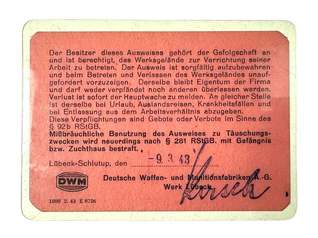 Deze Duitse ausweis in goede conditie, dateert uit 1943 en werd gebruikt door een Nederlander die als dwangarbeider werkte bij de DWM, ook wel bekend als de Deutsche Waffen- und Munitionsfabriken A.G. in Lubeck.