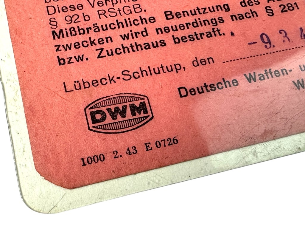 This German ausweis in good condition, dates from 1943 and was used by a Dutchman who worked as a forced laborer at the DWM, also known as the Deutsche Waffen- und Munitionsfabriken A.G. in Lubeck.