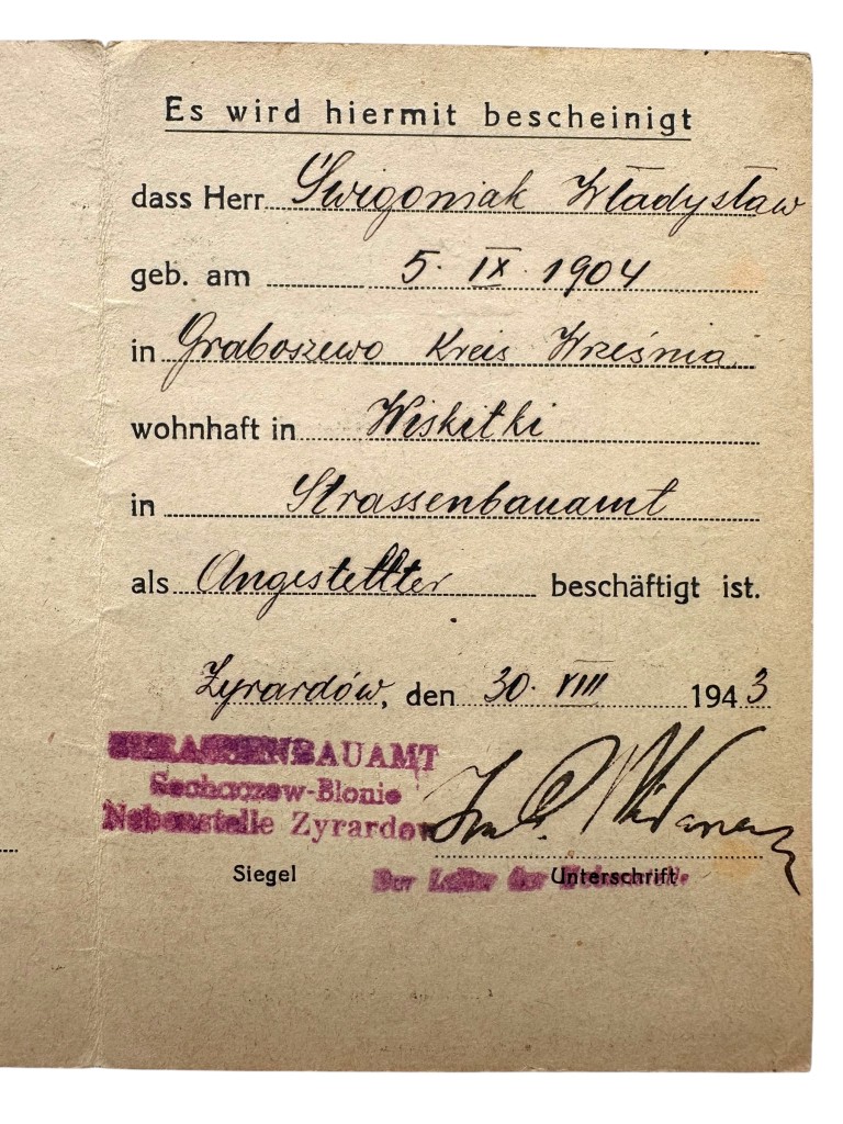 Gedateerd op 30 maart 1943 en afgegeven in Zyrądów.