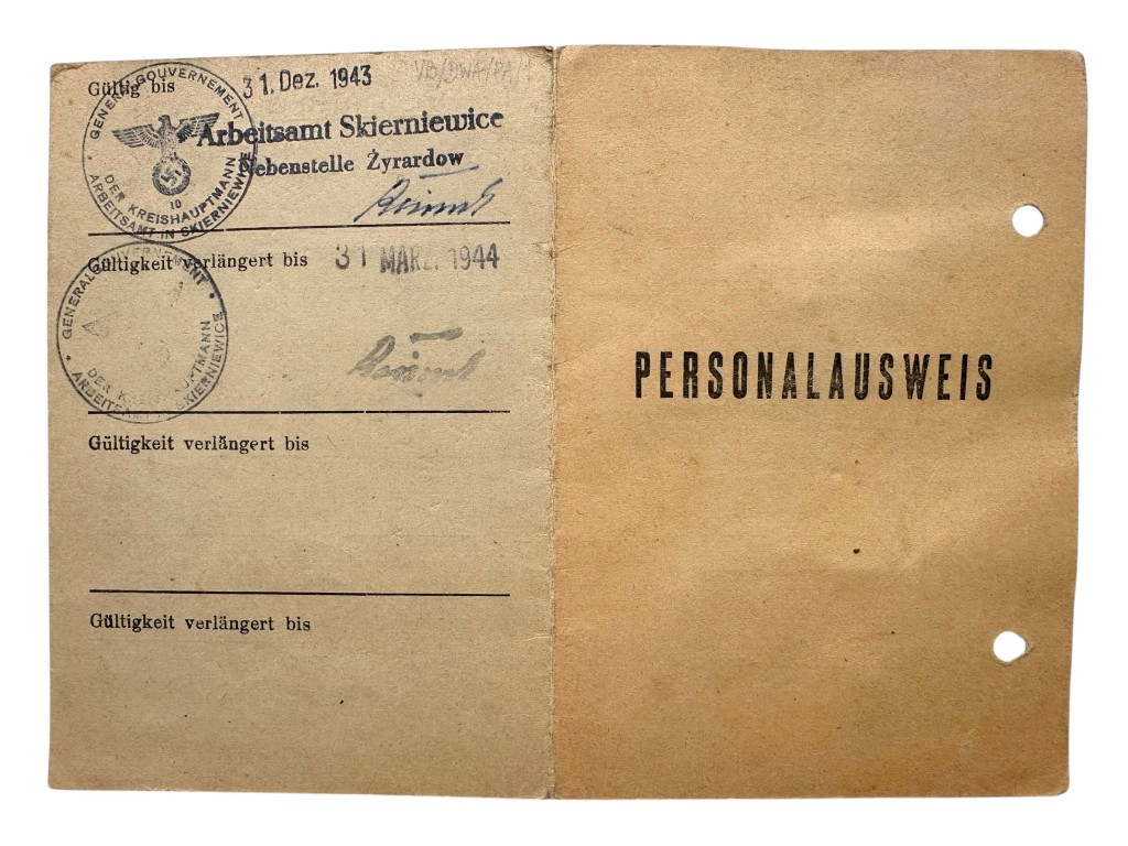 Bevat meerdere officiële stempels van het Generalgouvernement en Arbeitsamt Skierniewice.