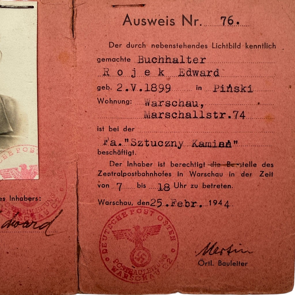 Deze originele Ausweis Nr. 76 betreft een Duits bezettingsdocument uit de Tweede Wereldoorlog, afgegeven in Warschau op 25 februari 1944 op naam van Edward Rojek, geboren op 2 mei 1899 te Pinski. Het document vermeldt zijn beroep als boekhouder (Buchhalter), zijn woonadres Warschau, Marschallstr. 74, en zijn tewerkstelling bij de firma „Sztuczny Kamień”.