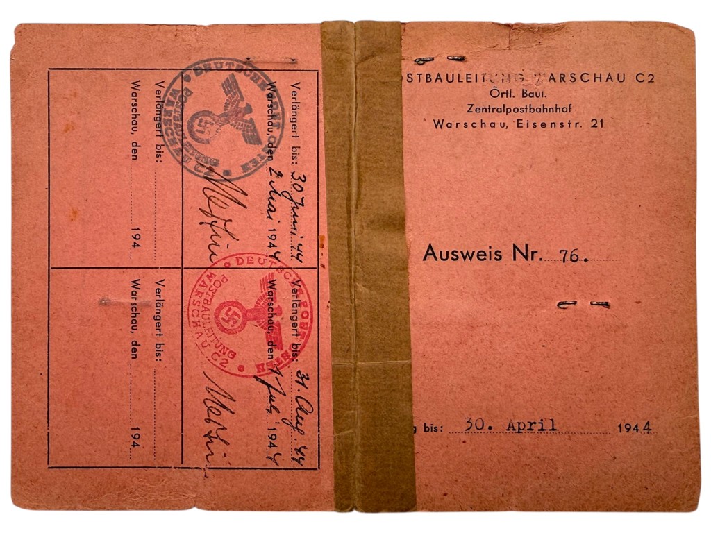 The condition is used and authentic, showing clear signs of age, folds, and wear consistent with intensive administrative use during wartime. During the Second World War (1939–1945), Warsaw formed part of the General Government under German occupation, where access to workplaces, infrastructure, and public facilities was strictly regulated through permits and identification documents.