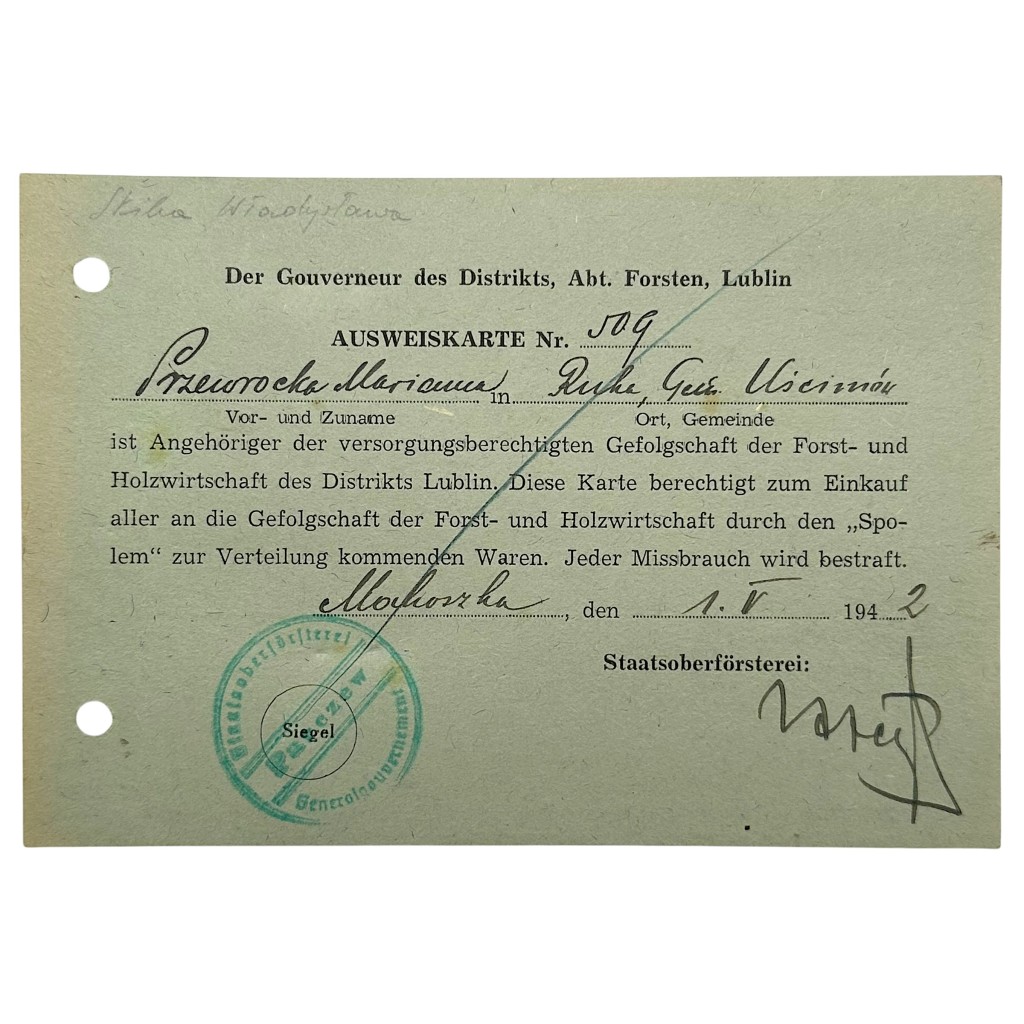 Deze originele Ausweiskarte / Legitymacja Nr. 509 betreft een Duits bezettingsdocument uit 1942, uitgegeven door de Gouverneur des Distrikts Lublin, Abt. Forsten (Gubernator Okręgu, Wydział Lasów, Lublin). De kaart staat op naam van Marianna Przewrocka, woonachtig in Ruda gm. Uścimów, en bevestigt haar status als lid van de bevoorradingsgerechtigde personeelsgroep binnen de bos- en houtwirtschaft van het district Lublin. Het document verleende haar het recht om goederen aan te kopen via de organisatie “Społem”, bestemd voor distributie onder werknemers van het bosbeheer. De legitimatie werd afgegeven in Włodawa op 1 mei 1942 en is voorzien van handgeschreven gegevens, originele handtekeningen en een duidelijke groene dienststempel van het Staatsbosbeheer (Nadleśnictwo Państwowe). De conditie is gebruikt en authentiek, met lichte gebruikssporen en perforatiegaten, passend bij administratief gebruik in oorlogstijd. Tijdens de Tweede Wereldoorlog (1939–1945) maakte het district Lublin deel uit van het Generalgouvernement, waar bosbouw en grondstoffenwinning onder streng toezicht stonden van de Duitse bezettingsautoriteiten vanwege het strategische belang voor de oorlogseconomie. Deze kaart betreft een historisch verzamelobject en vormt een tastbaar bewijs van de administratieve organisatie en distributiestructuur binnen bezet Polen; voor verzamelaars van Tweede Wereldoorlog-documentatie en militaria is dit een karakteristiek en representatief stuk. Dit soort lokale legitimatiekaarten uit de Poolse bezettingsperiode zijn tegenwoordig lastig te vinden.