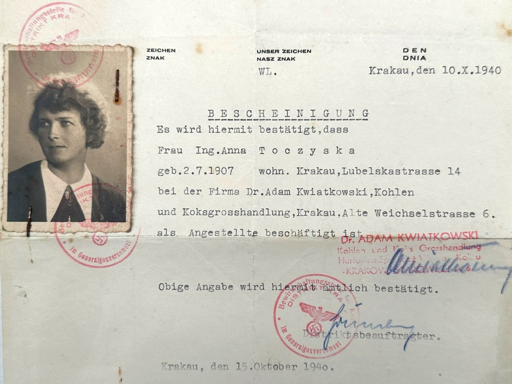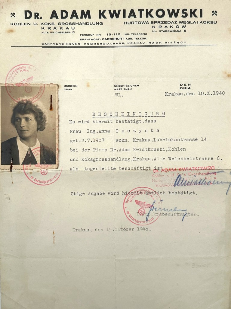 De verklaring bevestigt haar tewerkstelling bij de firma Dr. Adam Kwiatkowski gespecialiseerd in kolen en koks groothandel gevestigd aan Alte Weichselstrasse 6 in Krakau.