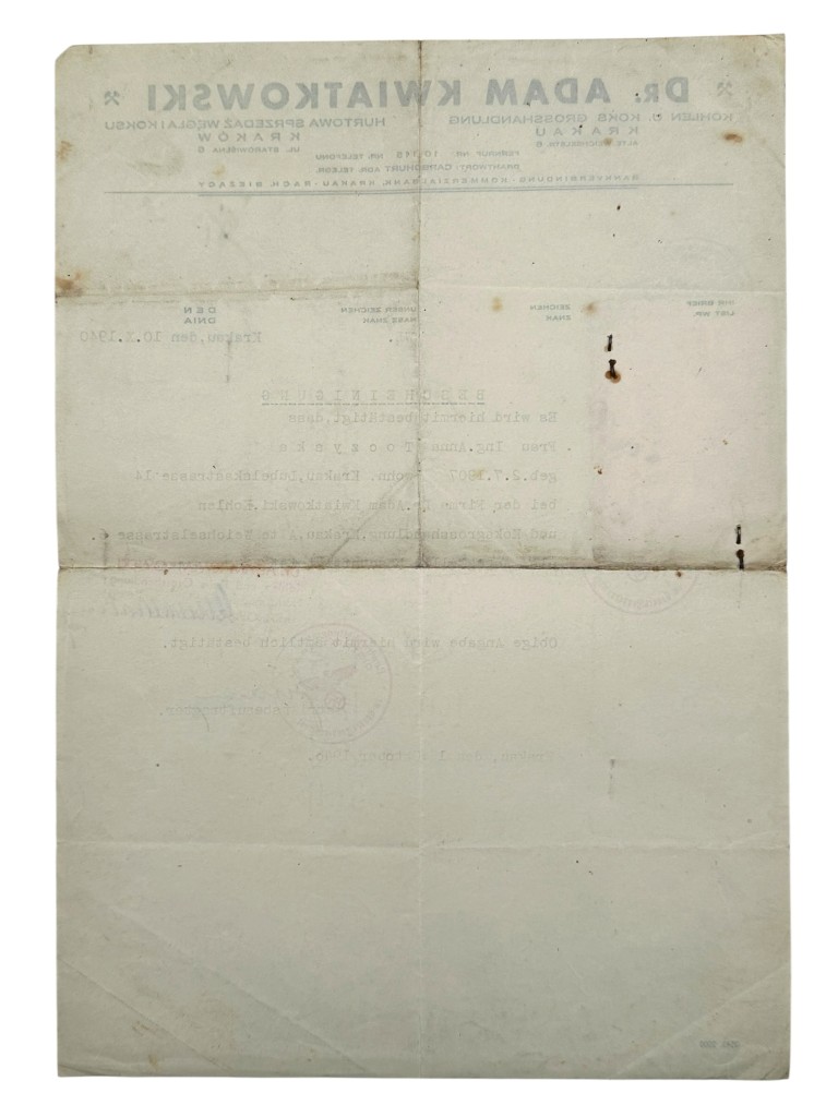 Original WWII German Bescheinigung Krakow in Poland 1940 – Dr Adam Kwiatkowski