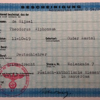 The ‘Bescheinigung’ is in good condition and belonged to a Dutchman who worked as a teacher (German) for the elementary school in Amsterdam.