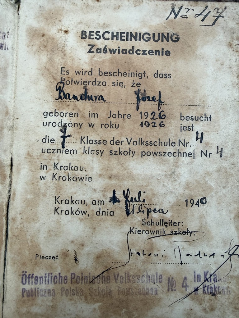 Deze originele Bescheinigung / Legitimatie (Meldekaart) betreft een Duits bezettingsdocument uit 1940, afgegeven aan Józef Bandura (geboren 1926), leerling van de 7e klas van de Öffentliche Polnische Volksschule Nr. 4 in Krakau (Kraków). Het document is voorzien van een pasfoto, handtekening van de houder, schoolstempels en datumvermelding juli 1940, en diende als officiële school- en legitimatieverklaring in bezet Polen.