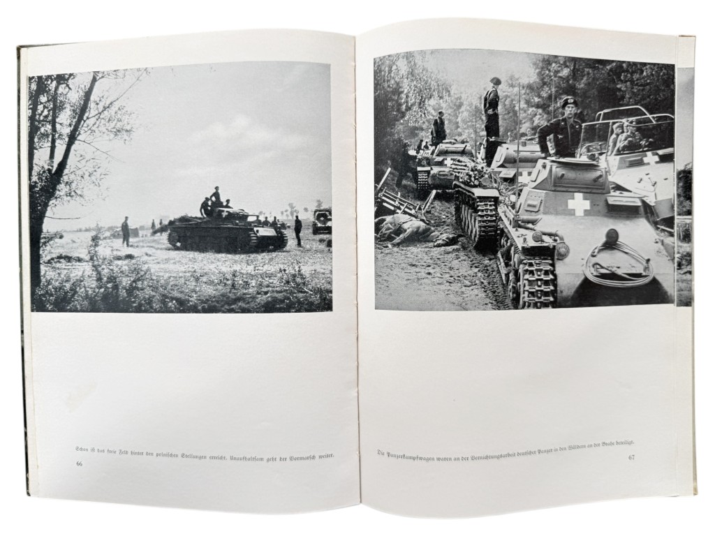 Binnenin bevinden zich talrijke zwart-wit foto’s van troepenbewegingen, voertuigen en frontsituaties.