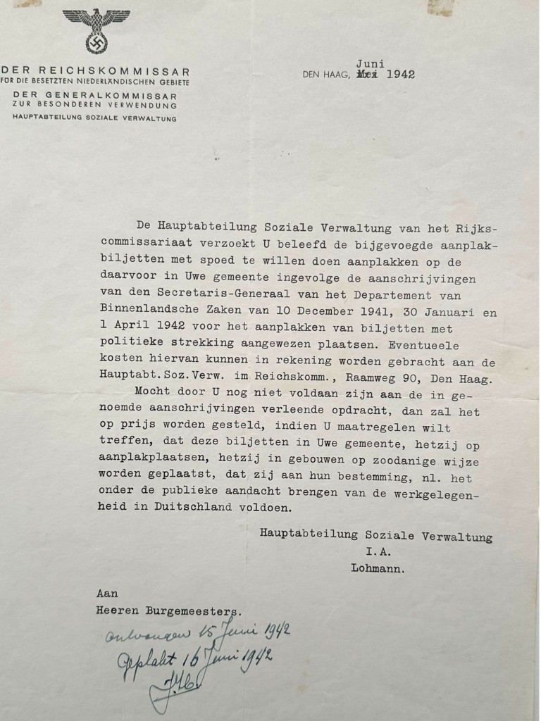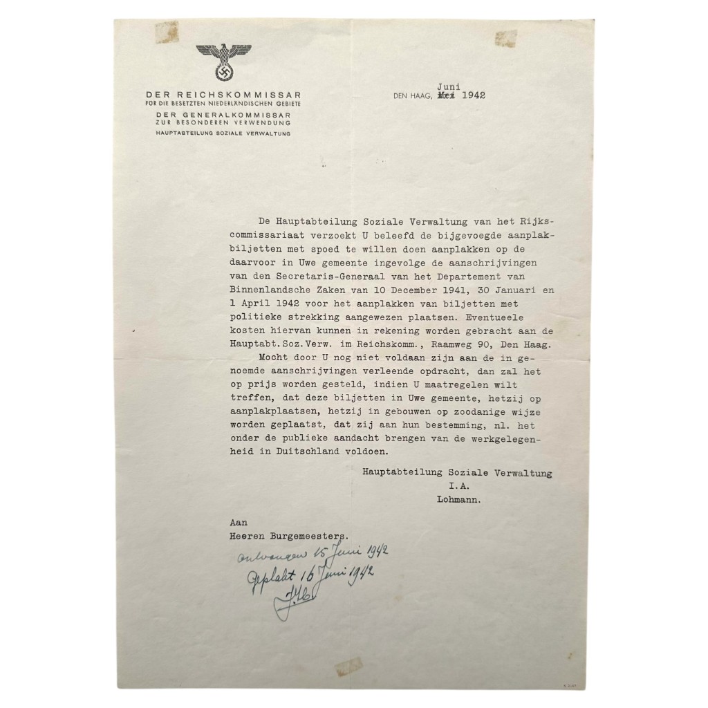 Origineel document uit de Tweede Wereldoorlog, gedateerd juni 1942 te Den Haag, afkomstig van het Rijkscommissariaat voor het bezette Nederlandse gebied (Der Reichskommissar für die besetzten niederländischen Gebiete), Hauptabteilung Soziale Verwaltung. Het getypte schrijven, voorzien van de gedrukte adelaar met hakenkruis in briefhoofd, is gericht aan de Nederlandse burgemeesters en betreft instructies inzake het aanplakken van biljetten met betrekking tot werkgelegenheid in Duitsland. Dit ambtelijke stuk geeft een indringend beeld van de bestuurlijke communicatie en de wijze waarop maatregelen vanuit de Duitse bezettingsautoriteiten aan lokale overheden werden doorgegeven.
