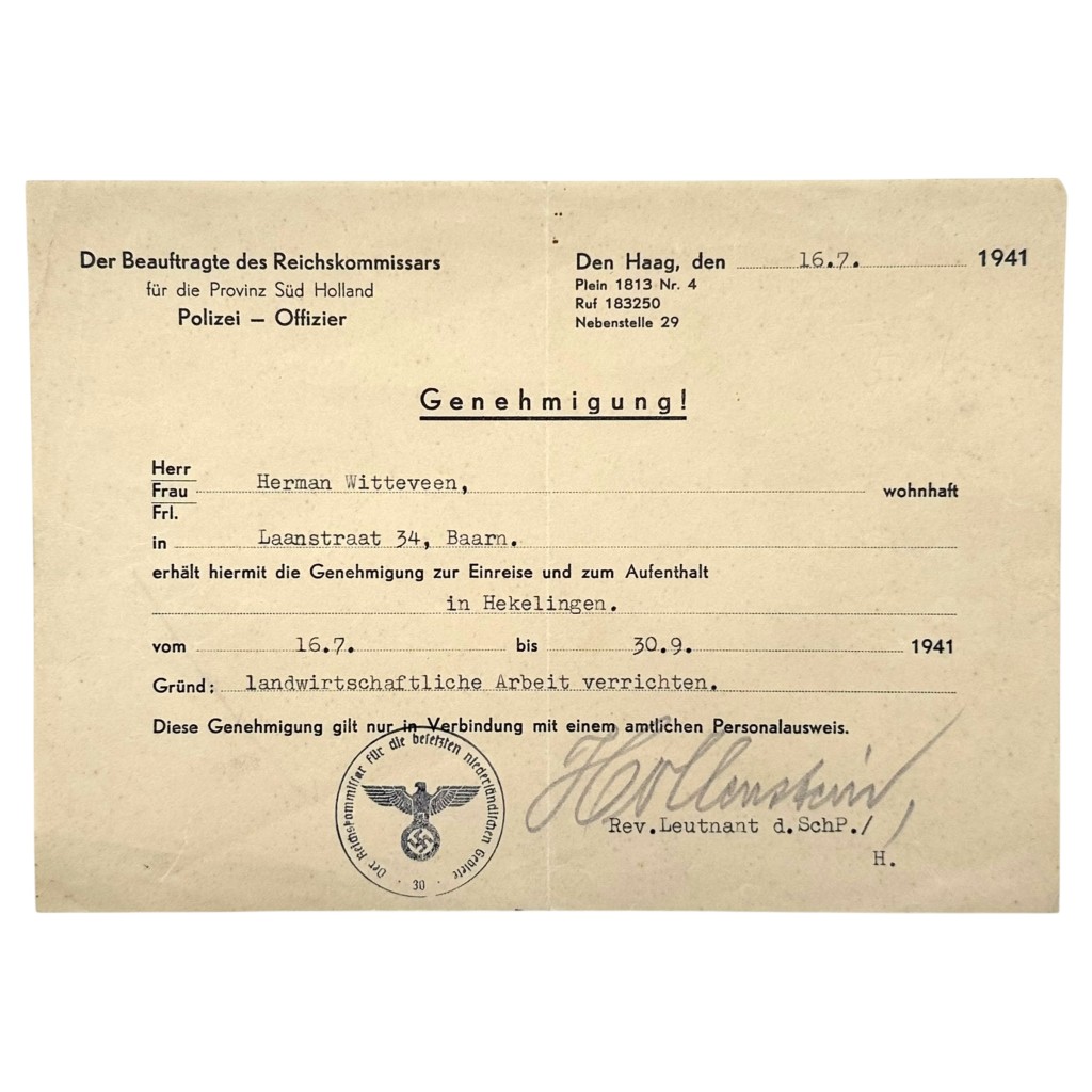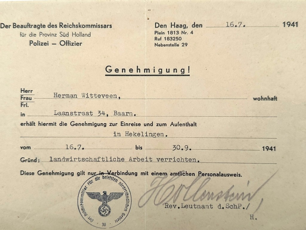 Origineel Duits bezettingsdocument uit de Tweede Wereldoorlog, uitgegeven door Der Beauftragte des Reichskommissars für die Provinz Süd-Holland – Polizei-Offizier, gedateerd Den Haag, 16 juli 1941. Het betreft een officiële Genehmigung (vergunning) verleend aan Herman Witteveen, wonende aan de Laanstraat 34 te Baarn. In het document wordt toestemming gegeven voor inreis en verblijf in Hekelingen in de periode van 16 juli tot 30 september 1941. Als reden wordt vermeld: “landwirtschaftliche Arbeit verrichten” (het verrichten van landbouwarbeid).
