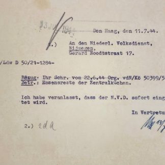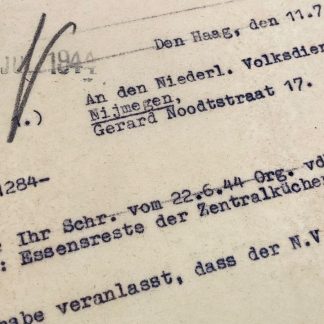 Het document is in gebruikte conditie en werd verstuurd vanuit Den Haag naar de NVD (Nederlandsche Volksdienst) in Nijmegen op 11 juli 1944.