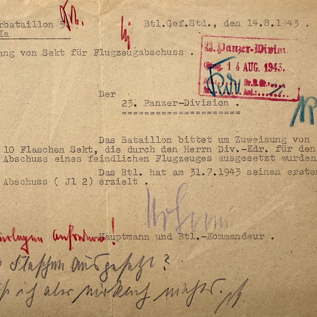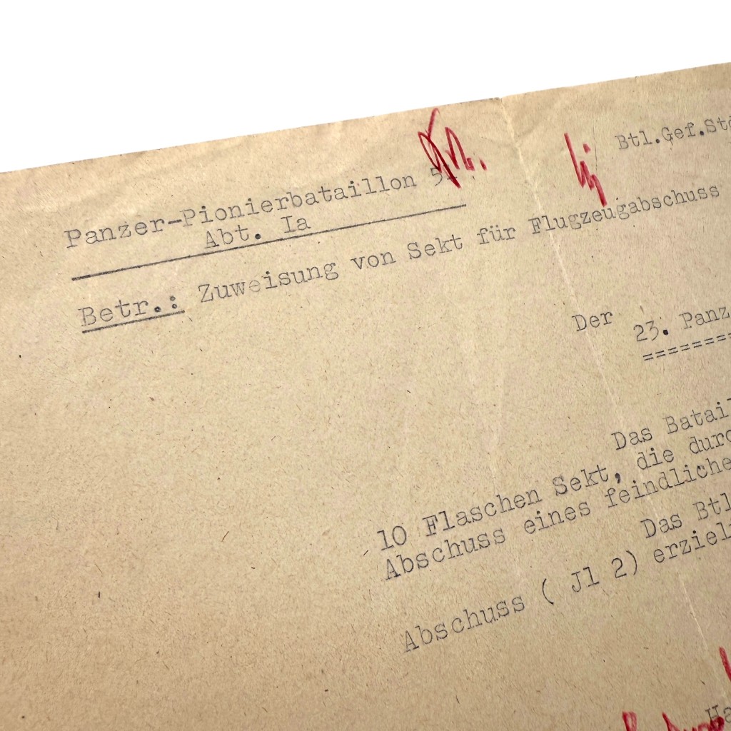 Dit Duitse document uit de Tweede Wereldoorlog, gedateerd 14 augustus 1943, is afkomstig van het Panzer-Pionierbataillon 51 en gericht aan de 23. Panzer-Division. De getypte melding betreft de aanvraag en toewijzing van 10 flessen sekt als beloning voor het neerhalen van een vijandelijk vliegtuig, een gebruikelijke praktijk binnen de Wehrmacht om bijzondere prestaties te erkennen. Het stuk bevat meerdere stempels, handgeschreven notities en correcties in rood en blauw potlood. Een interessant document voor verzamelaars van Duitse WOII frontadministratie en Panzer-gerelateerde stukken.