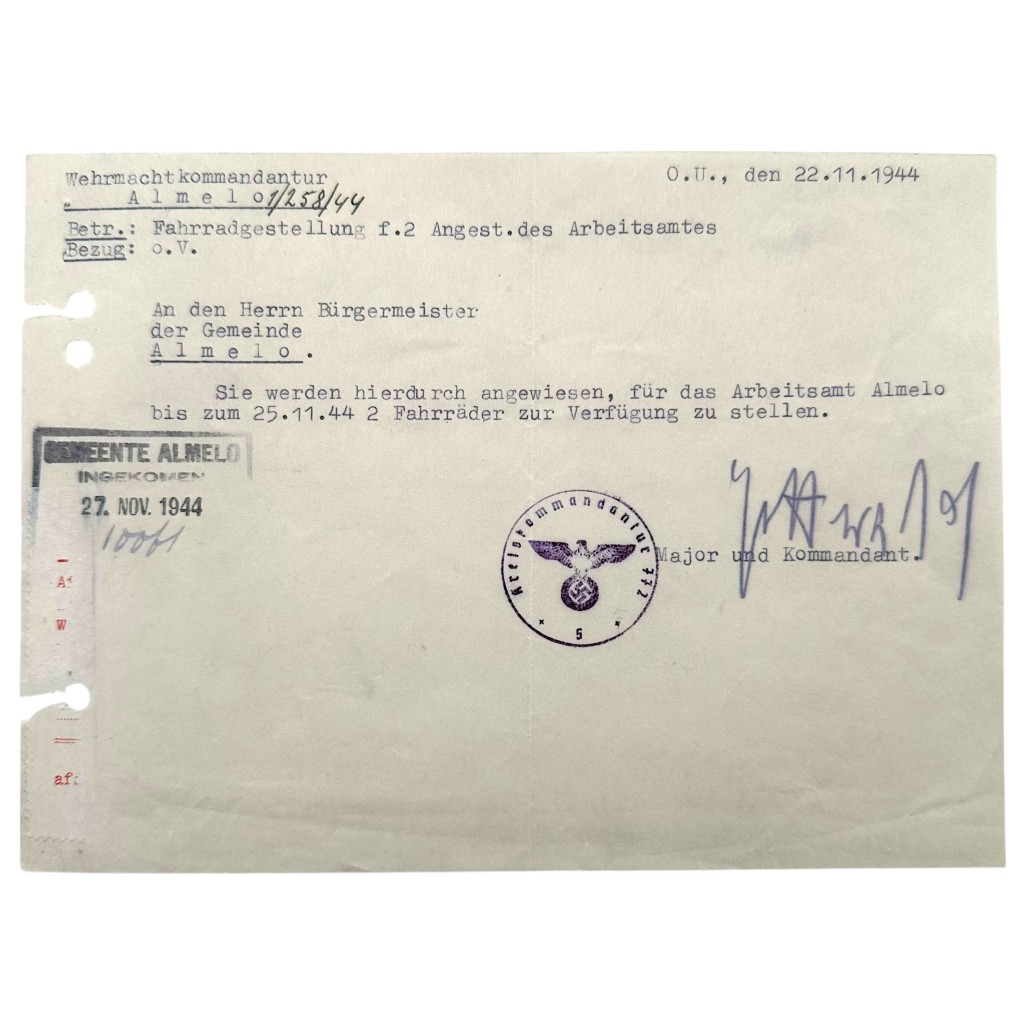 Origineel Duits bezettingsdocument uit de Tweede Wereldoorlog, gedateerd 22 november 1944, afkomstig van de Wehrmachtkommandantur Almelo. In dit getypte schrijven wordt de burgemeester van Almelo officieel opgedragen om twee fietsen ter beschikking te stellen aan het Arbeitsamt, een treffend voorbeeld van de vorderingen en maatregelen die tijdens de bezettingsperiode werden opgelegd. Het document is voorzien van officiële stempels, waaronder die van de gemeente Almelo (ontvangen 27 november 1944), en draagt een handgeschreven ondertekening van de bevoegde Wehrmacht-commandant. Een historisch interessant document dat een direct inkijkje geeft in de administratieve praktijk van de Duitse bezettingsautoriteiten in Nederland in de nadagen van de oorlog. Interessant verzamelobject voor geïnteresseerden in Tweede Wereldoorlog-documenten en Nederlandse bezettingsgeschiedenis.