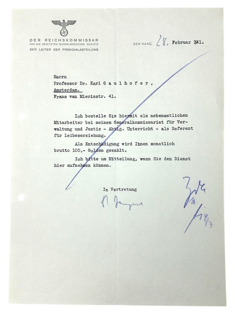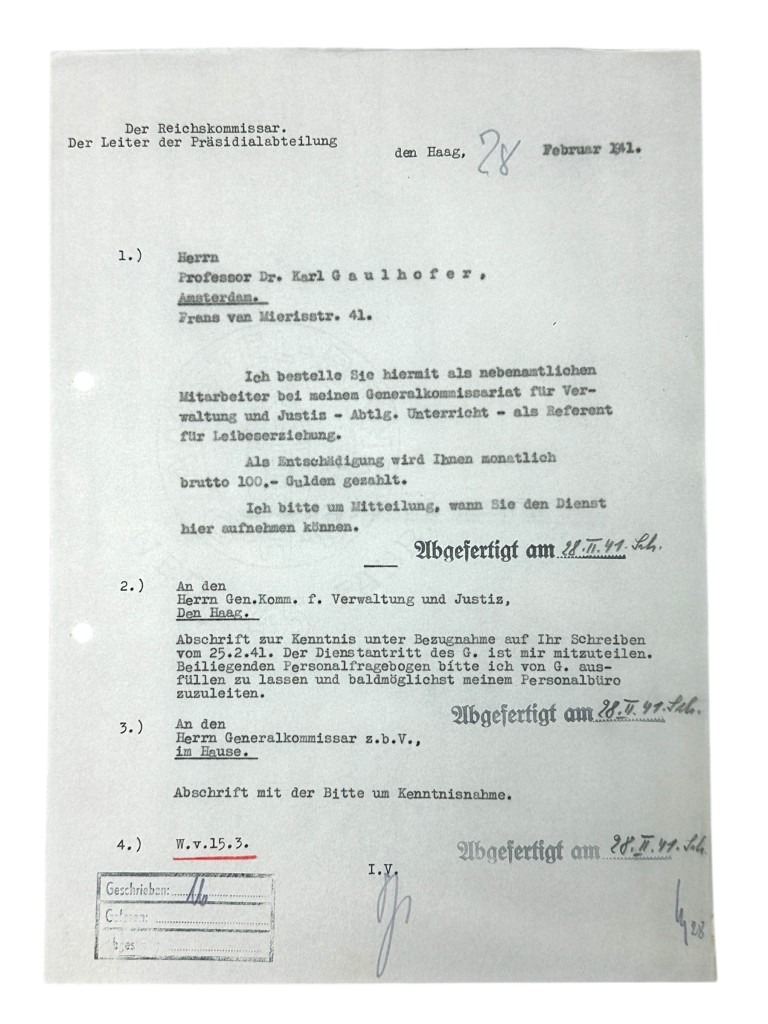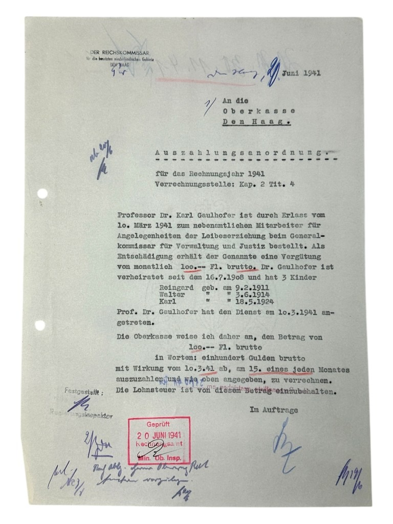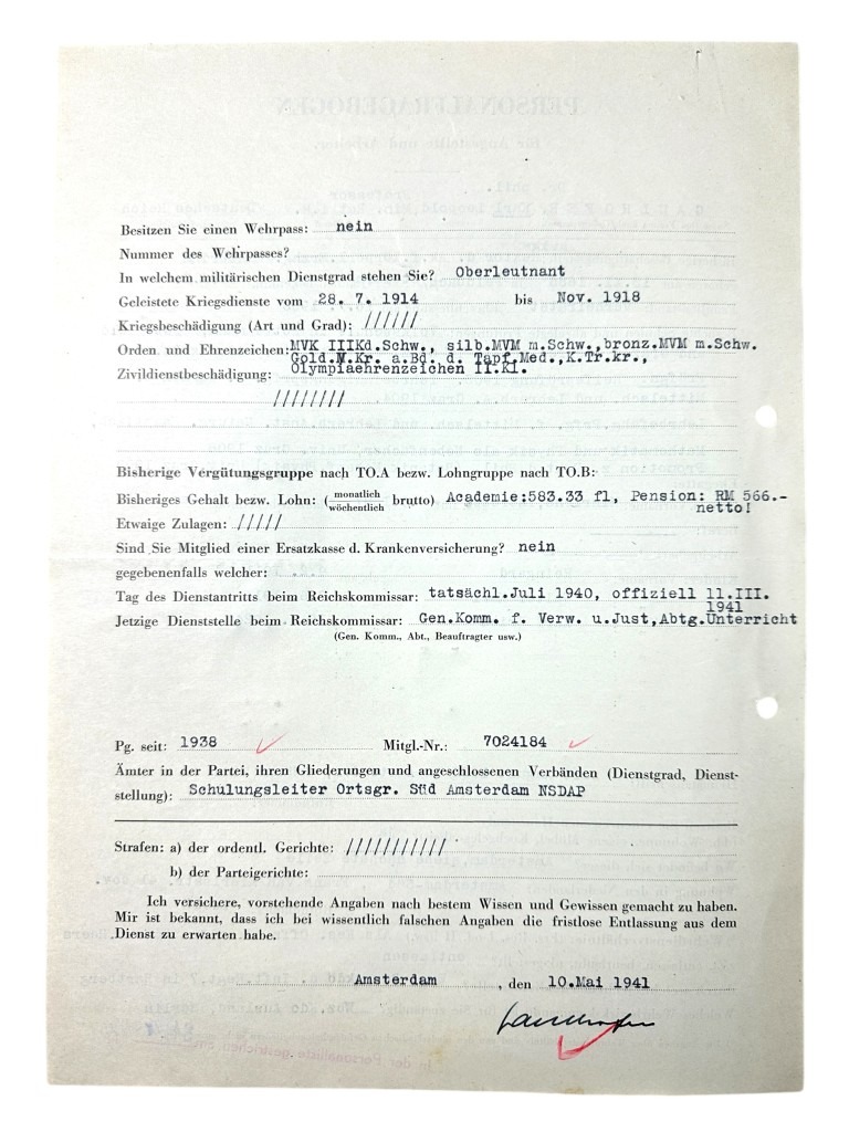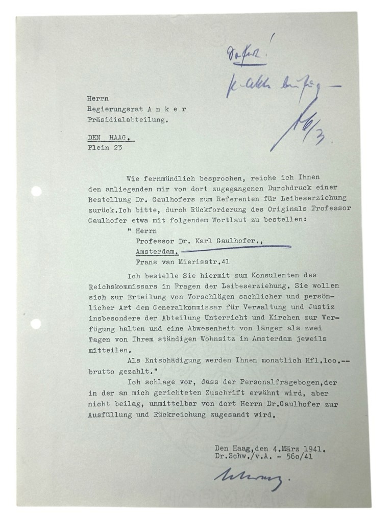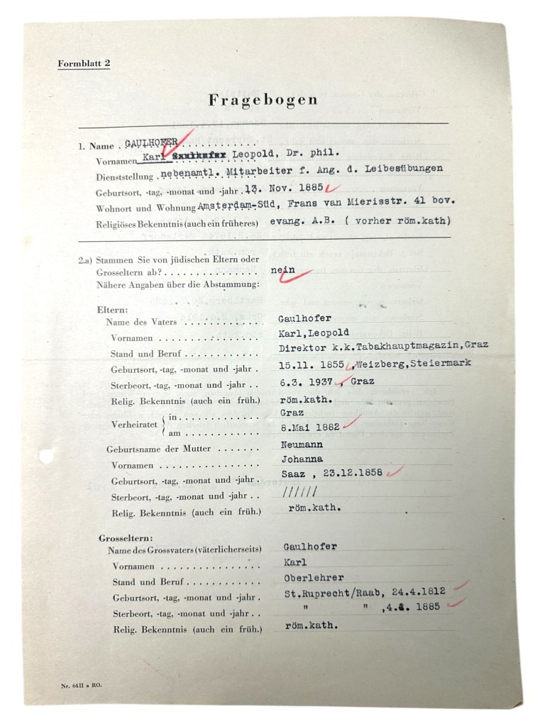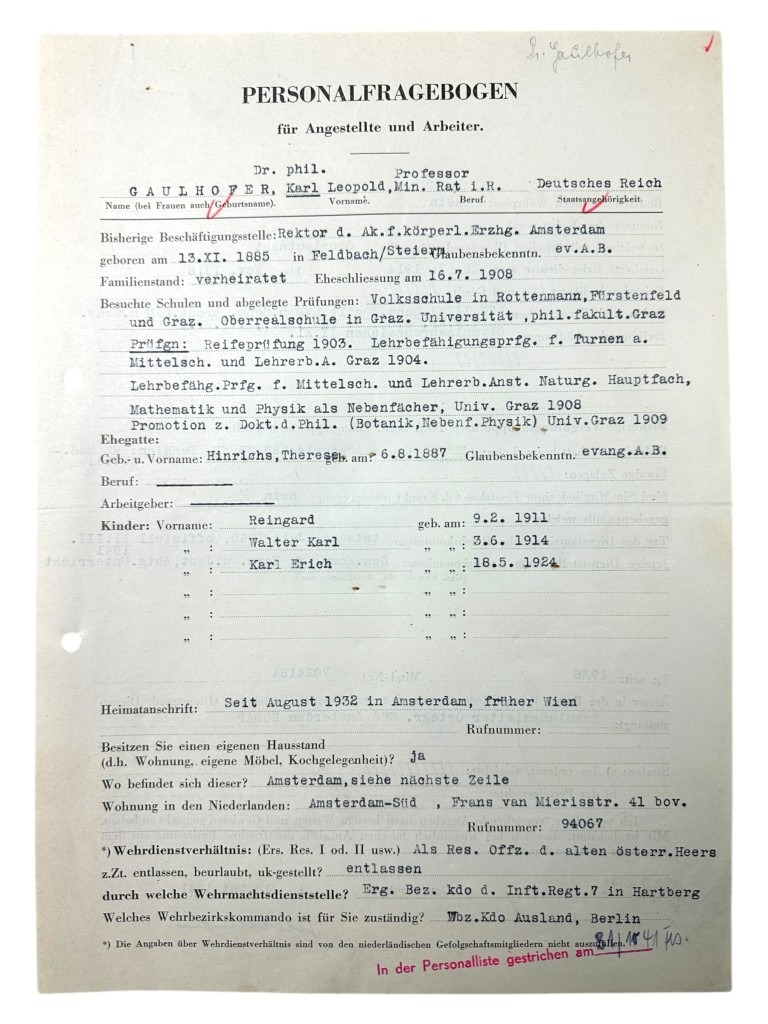 This set of 21 German documents is in good condition and concerns the questionnaire and many other interesting documents of Karl Leopold Gaulhofer in Amsterdam during World War II.