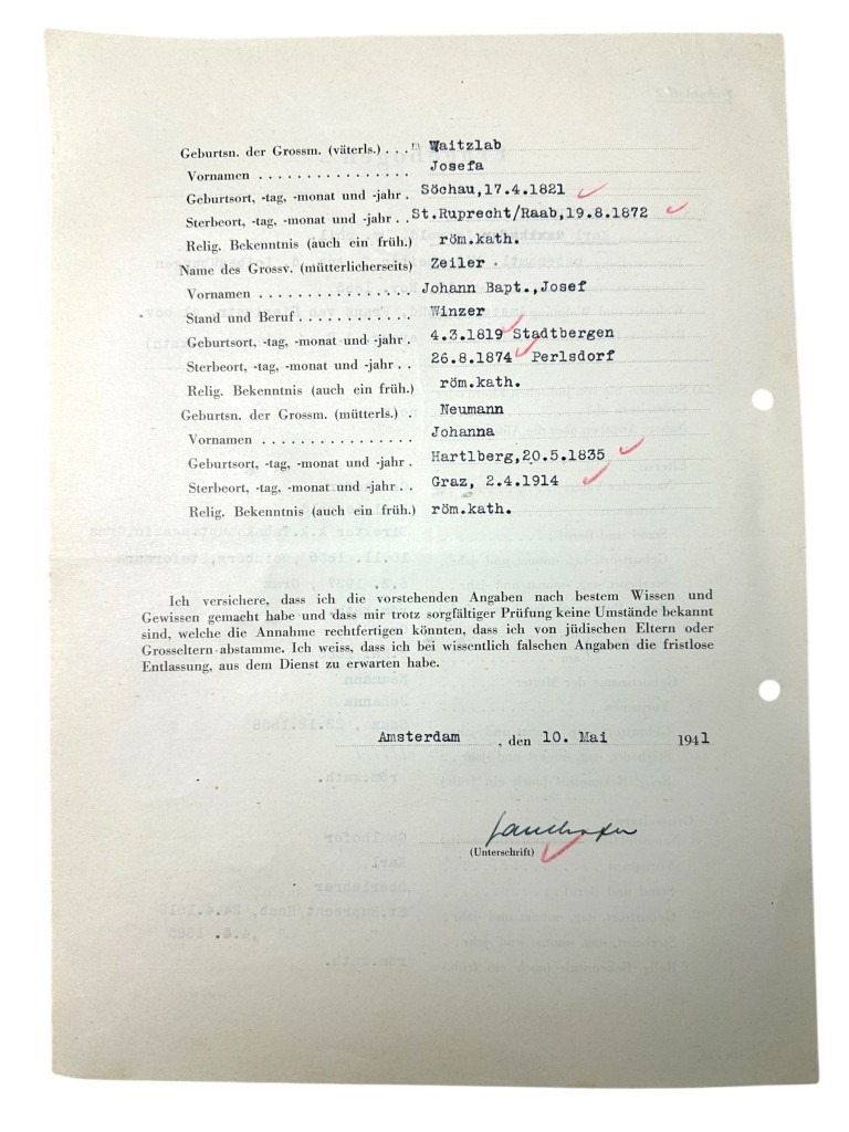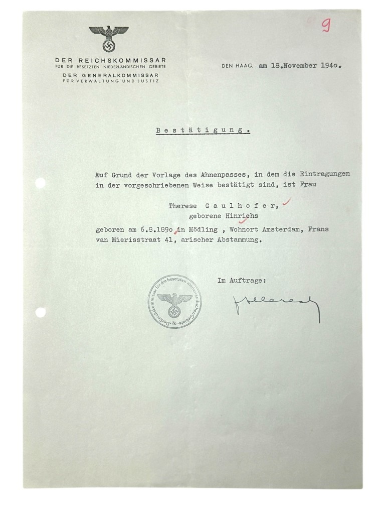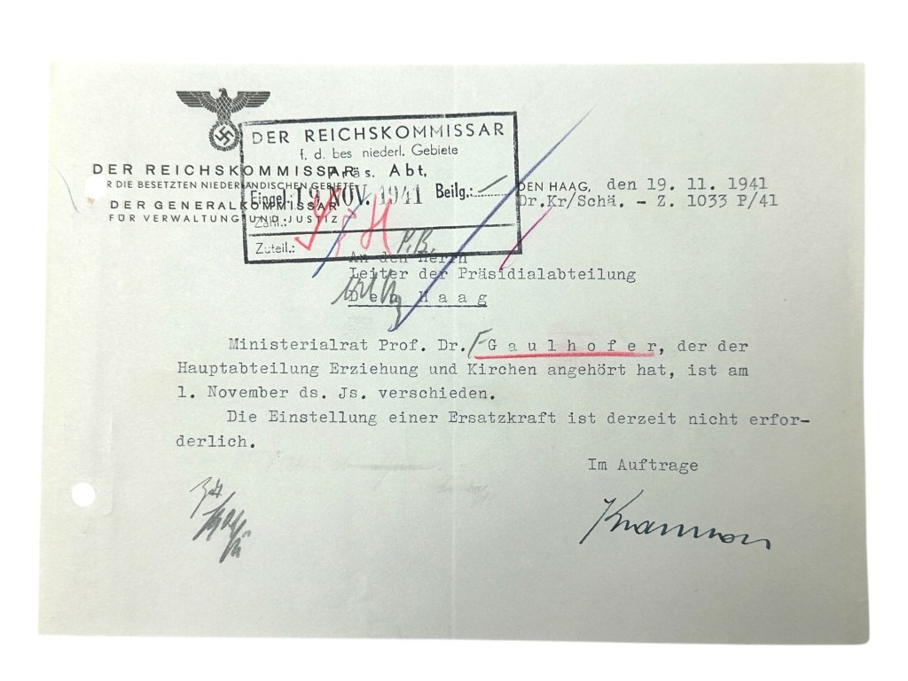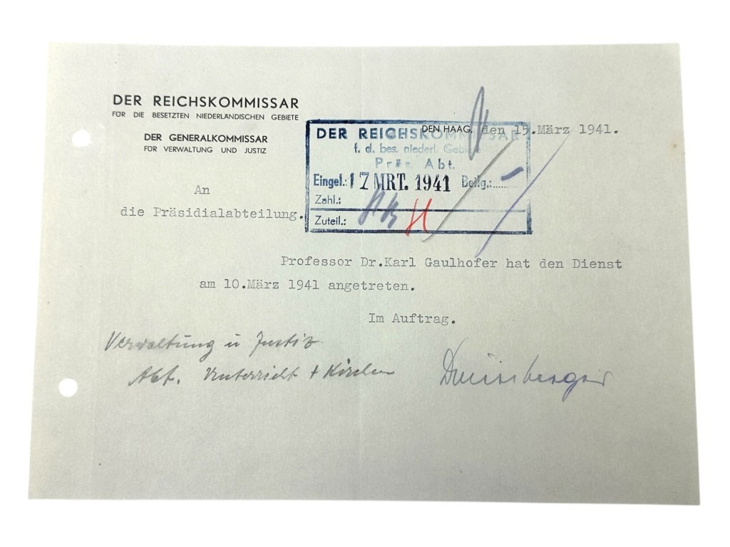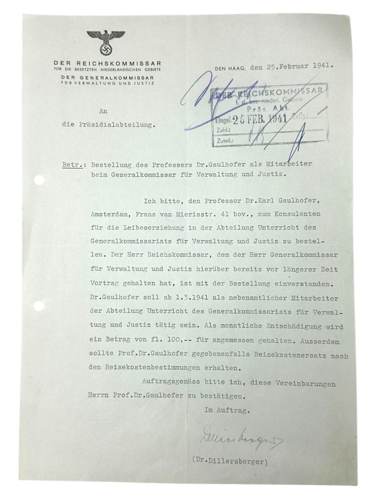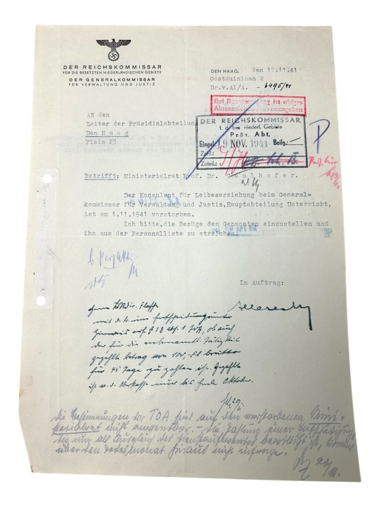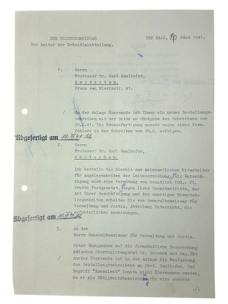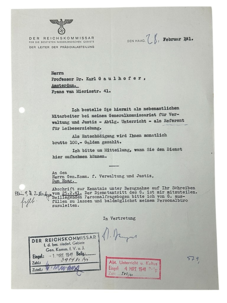This set of 21 German documents is in good condition and concerns the questionnaire and many other interesting documents of Karl Leopold Gaulhofer in Amsterdam during World War II.