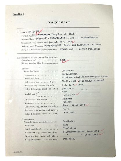 Deze set van 21 Duitse documenten is in goede conditie en betreft de vragenlijst en vele andere interessante documenten van Karl Leopold Gaulhofer in Amsterdam tijdens de Tweede Wereldoorlog.