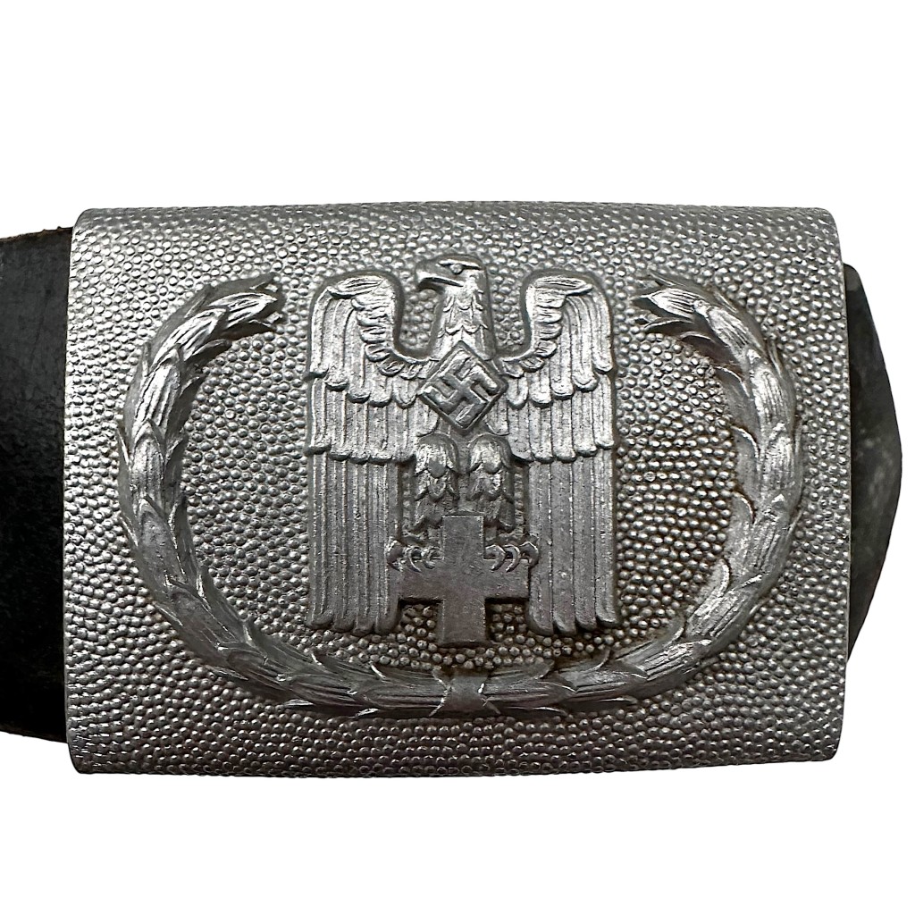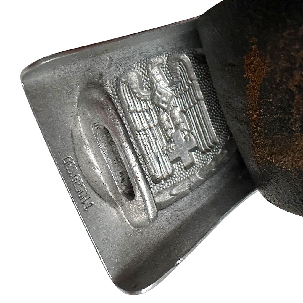 This German DRK belt (Deutsches Rotes Kreuz) from the Second World War consists of a black leather belt with its matching aluminium buckle. The buckle features the DRK emblem with eagle, wreath, and cross, executed in relief against a finely pebbled background. The interior shows clear signs of wear consistent with a period-used example. The belt is complete with its original fastening.