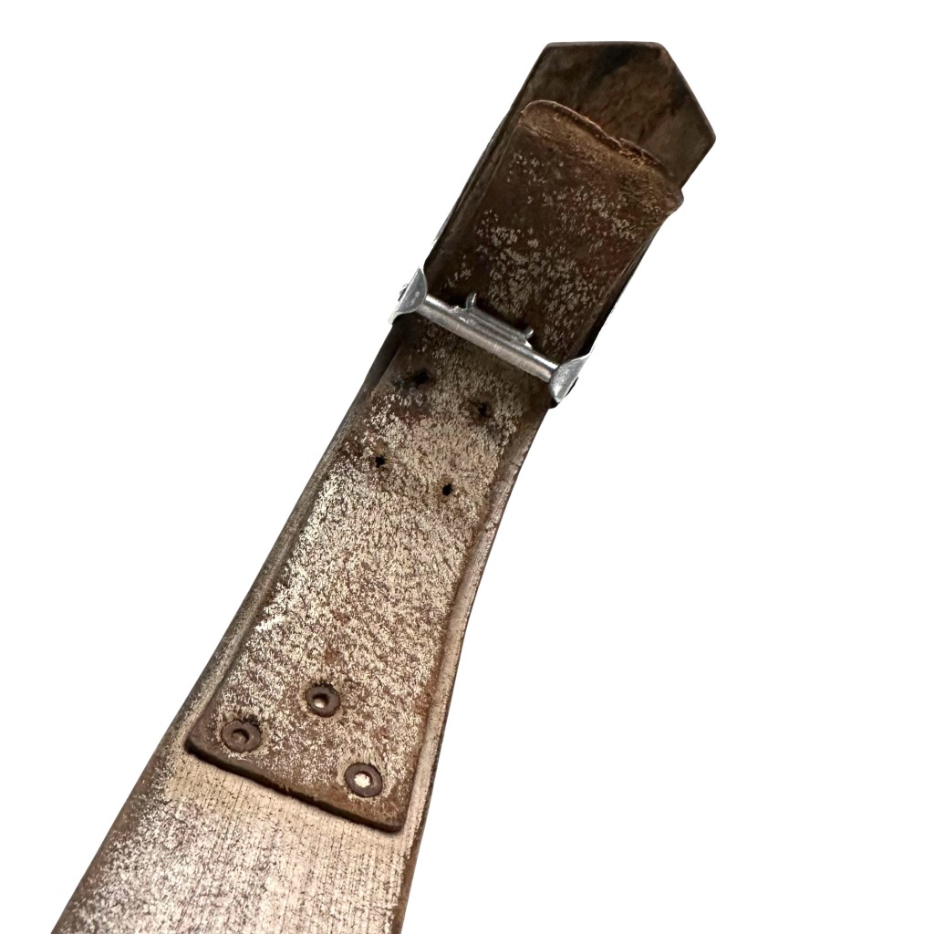Deze Duitse DRK-riem (Deutsches Rotes Kreuz) uit de Tweede Wereldoorlog bestaat uit een zwart leren riem met bijbehorend aluminium koppelslot. Het koppelslot is voorzien van het DRK-embleem met adelaar, krans en kruis, uitgevoerd in reliëf tegen een fijn gestippelde achtergrond. De binnenzijde toont duidelijke gebruikssporen die passen bij een gedragen exemplaar uit de periode. De riem is compleet met originele bevestiging. Een interessant verzamelobject voor de DRK of koppelsloten collectie!