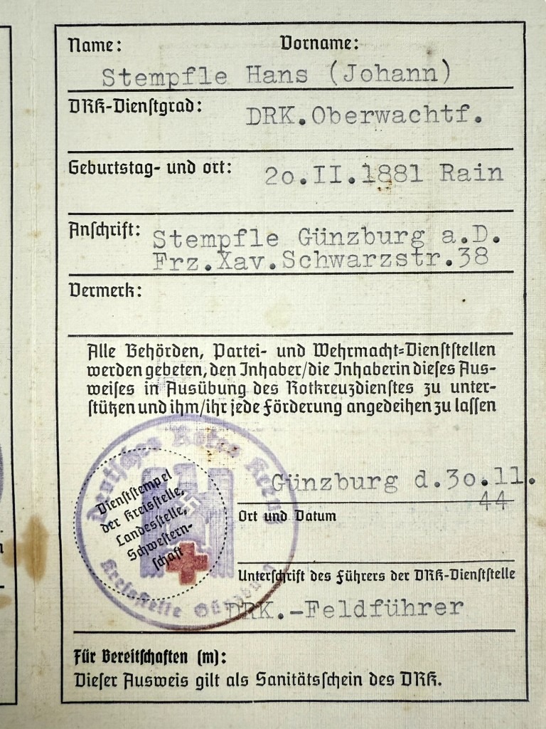 This German Red Cross (Deutsches Rotes Kreuz) personnel ID card from World War II was issued to DRK Oberwachtführer Hans (Johann) Stempfle from Günzburg.