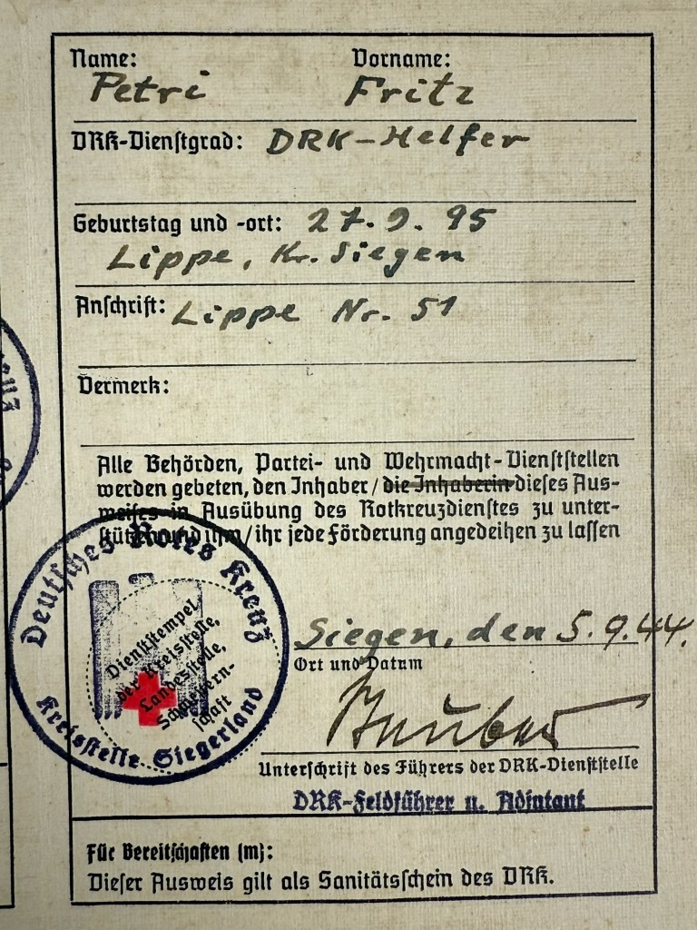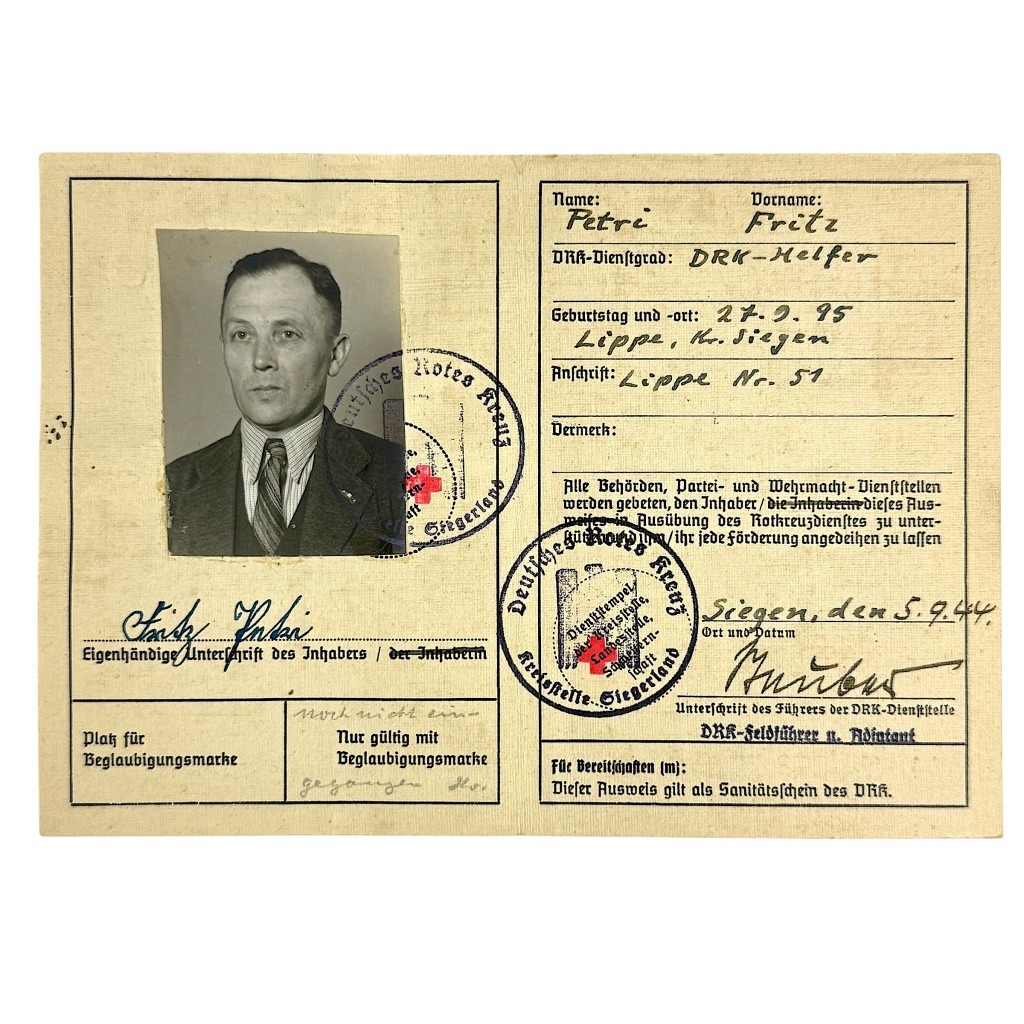 This German Red Cross (Deutsches Rotes Kreuz) Personalausweis from World War II was issued to DRK helper Fritz Petri from Siegen.