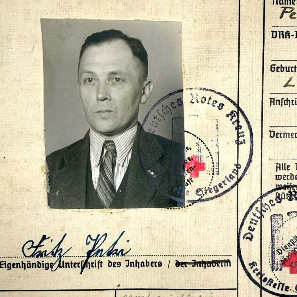 Deze Duits Rode Kruis (Deutsches Rotes Kreuz) Personalausweis uit de Tweede Wereldoorlog werd uitgegeven aan DRK-helper Fritz Petri uit Siegen.