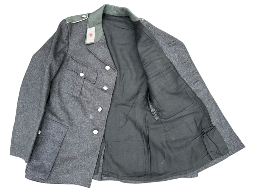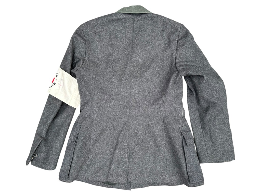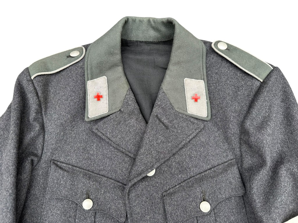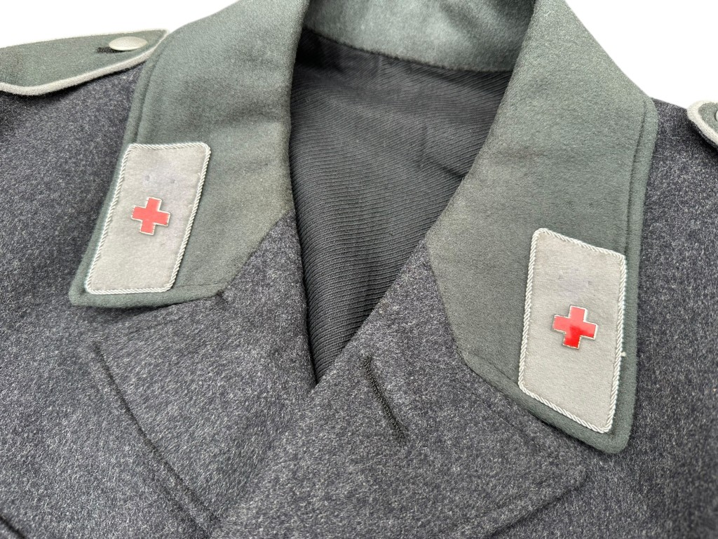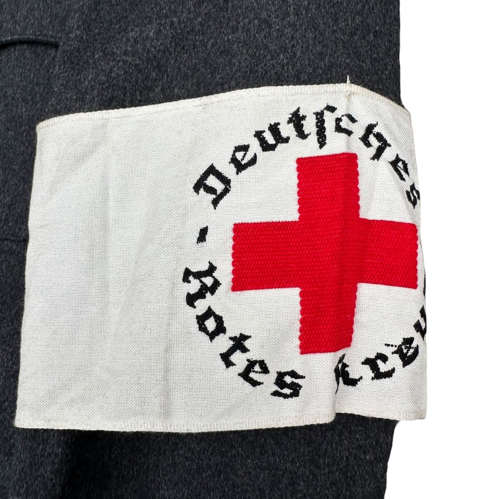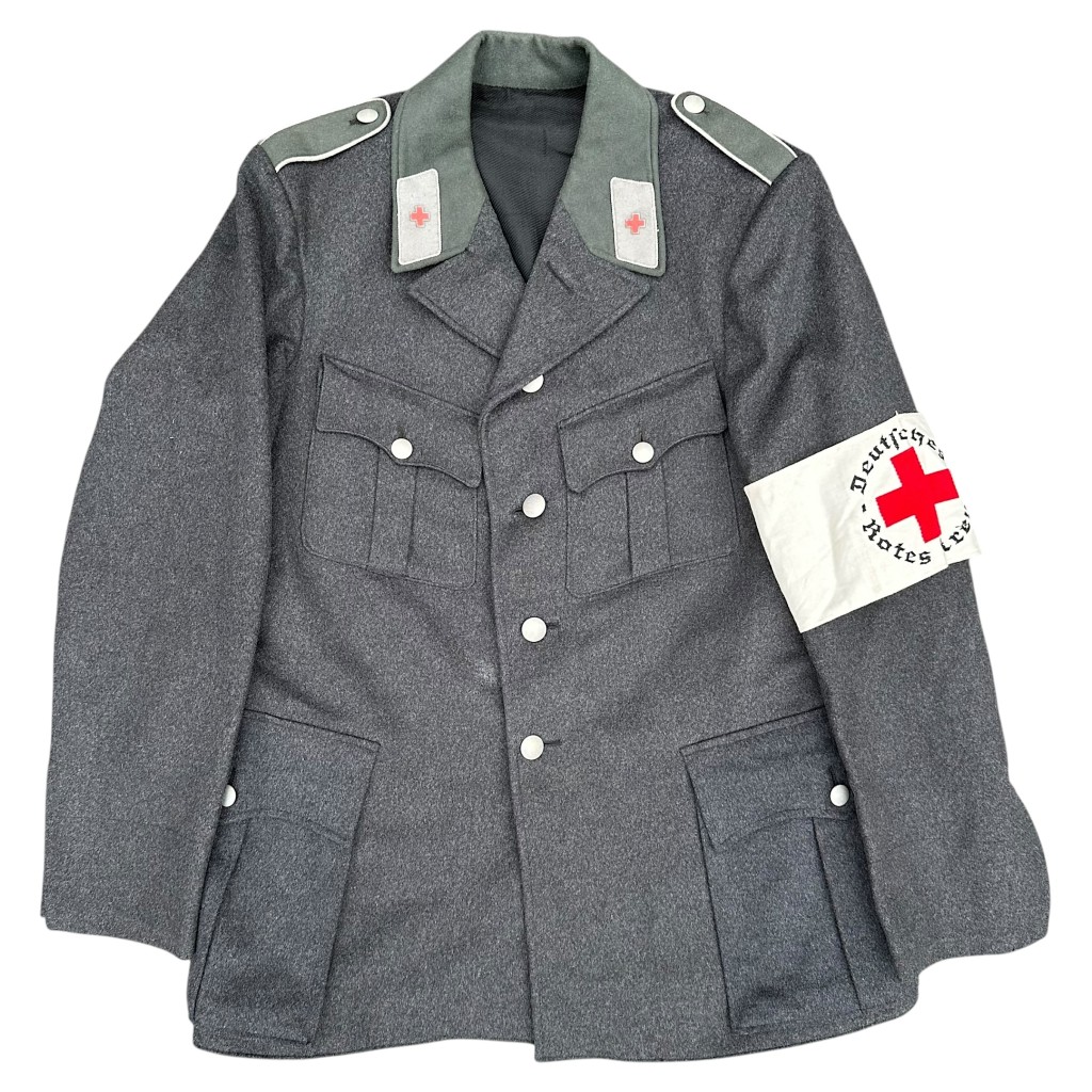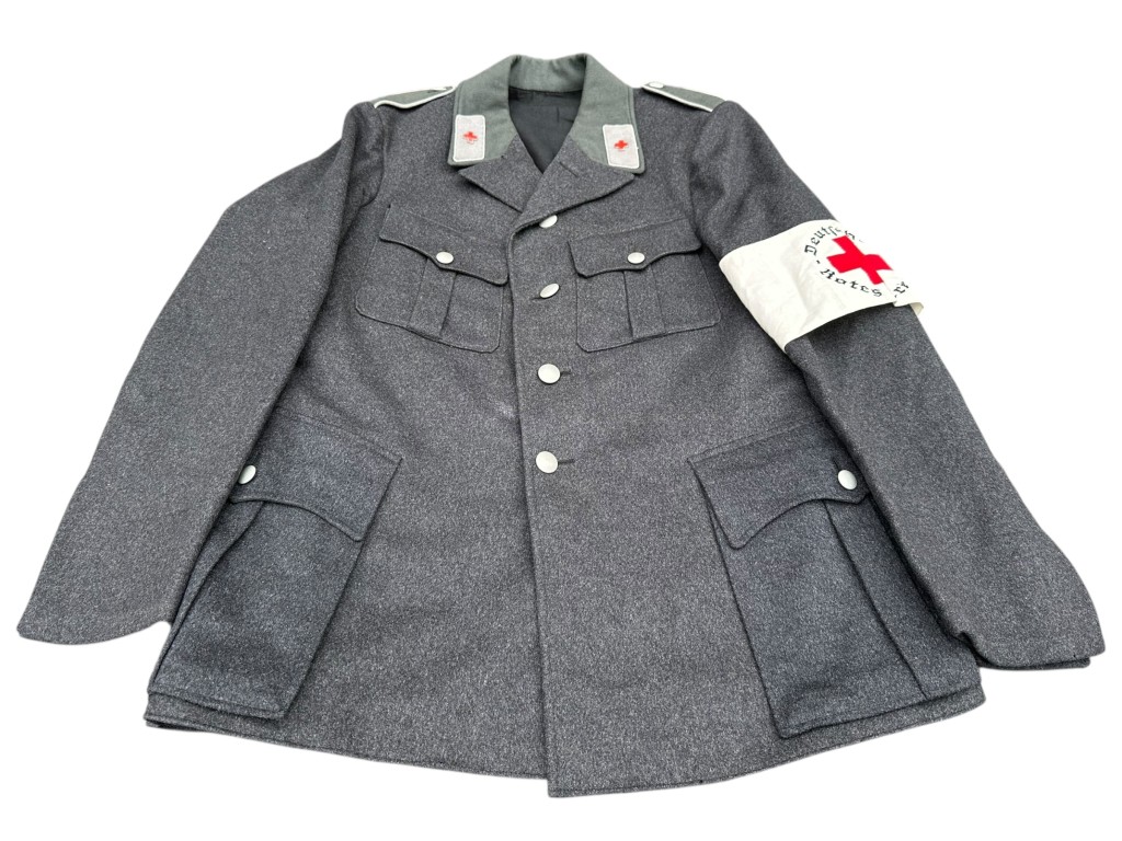 Beautiful original German DRK (Deutsches Rotes Kreuz) uniform jacket with armband from the Second World War, made in the characteristic field-grey cloth with dark green collar and shoulder boards.