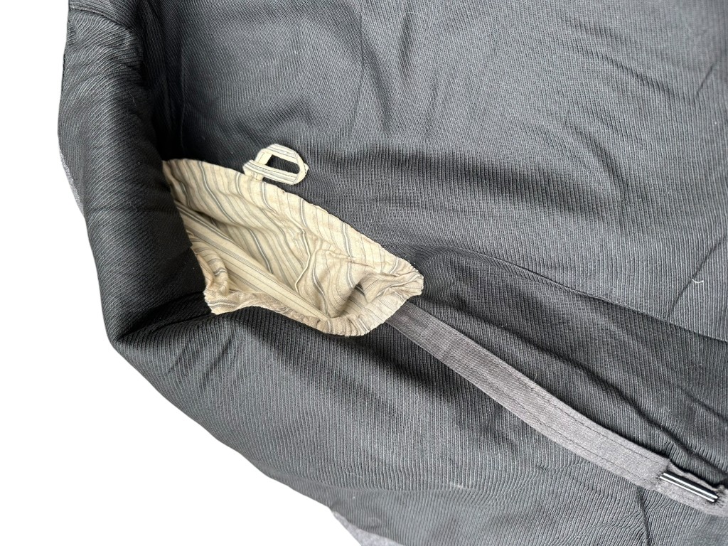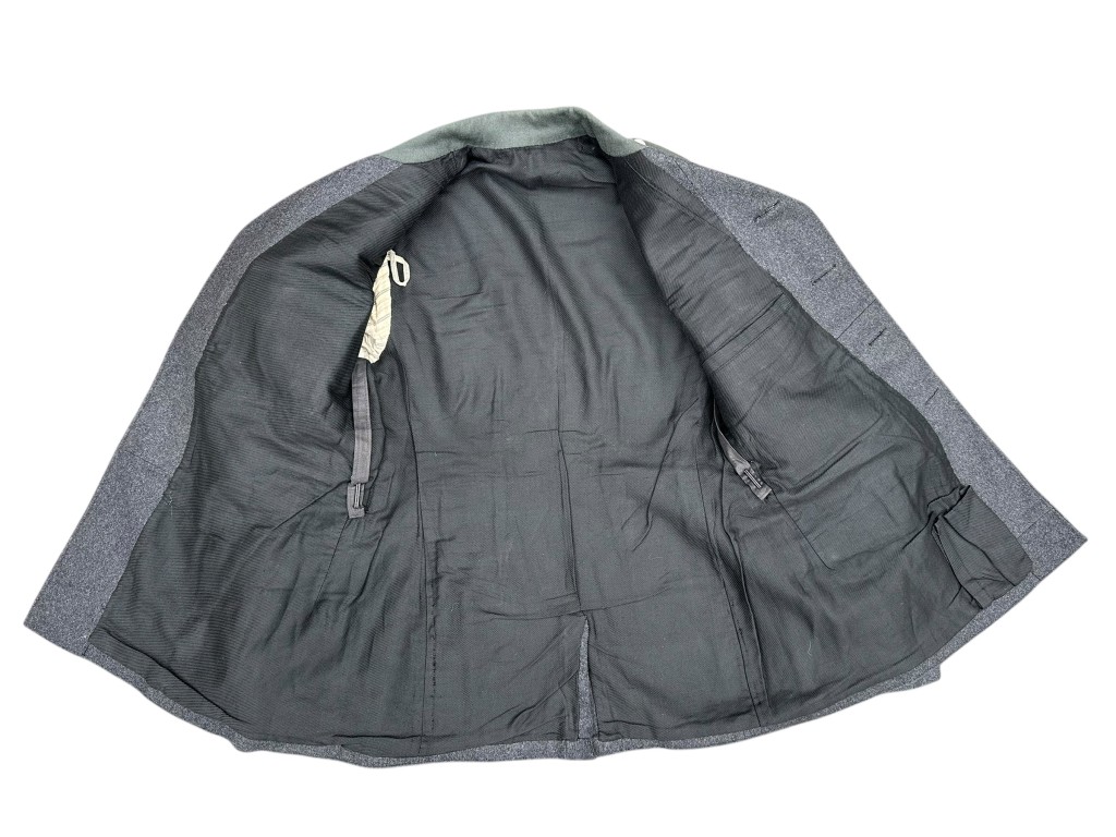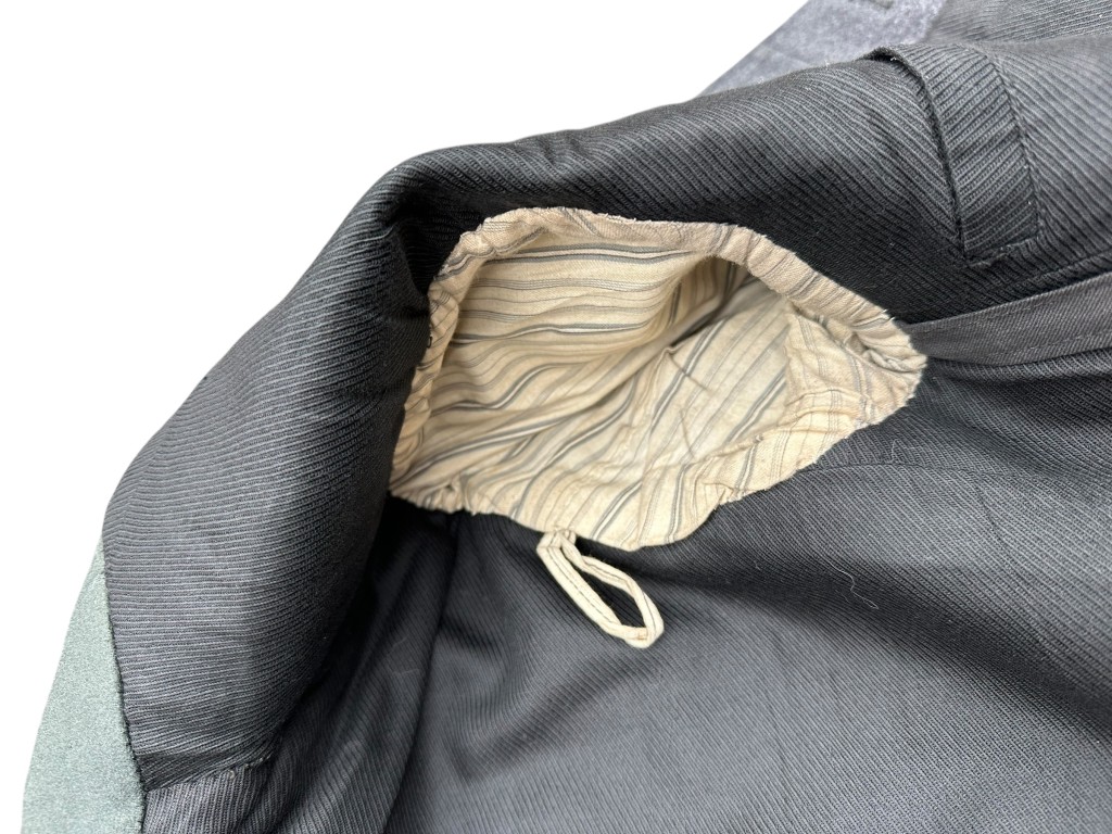 Prachtige originele Duitse DRK (Deutsches Rotes Kreuz) uniformjas met armband uit de Tweede Wereldoorlog, uitgevoerd in de karakteristieke veldgrijze stof met donkergroene kraag en schouderstukken. De jas is compleet met de correcte rode kruis kraagspiegels, aluminiumkleurige knopen en de witte DRK-armband met rood kruis en opschrift “Deutsches Rotes Kreuz”. Bijzonder detail is de duidelijke stempel op de binnenzijde van de armband, waaruit blijkt dat deze jas afkomstig is van de Kreisstelle Saarbrücken. Het interieur is netjes gevoerd en voorzien van binnenzakken en een ophanglus, wat wijst op degelijk vakmanschap uit de periode. Een uitstekend verzamelobject en een indrukwekkend displaystuk voor liefhebbers van Duitse WOII-militaria en DRK-gerelateerde uitrusting.