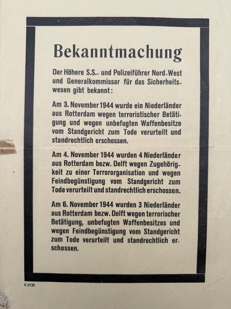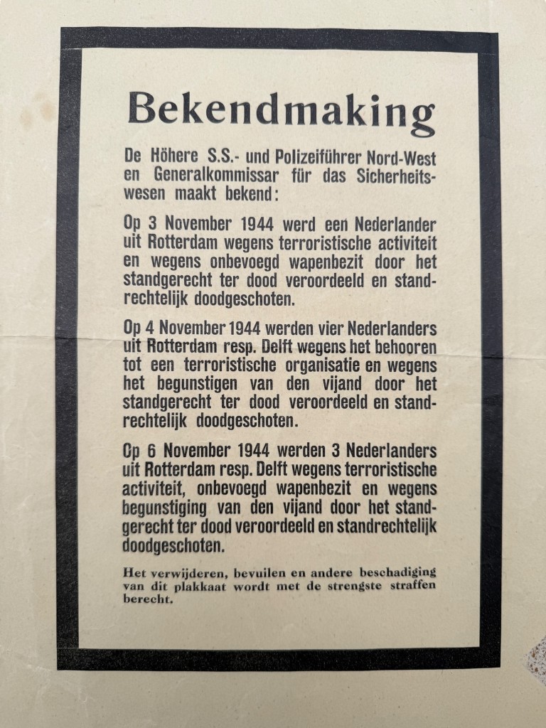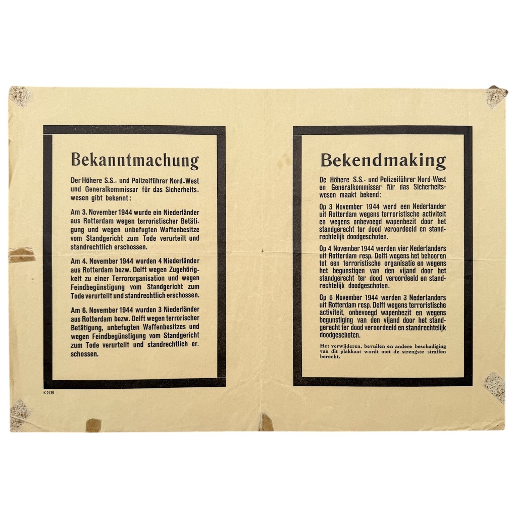 Deze tweetalige bekendmaking (in het Duits en Nederlands) werd verspreid in Rotterdam en Delft en maakt melding van de executie van meerdere Nederlandse verzetsleden, veroordeeld wegens “terroristische activiteit”, “onbevoegd wapenbezit” en “vijandbegunstiging”.