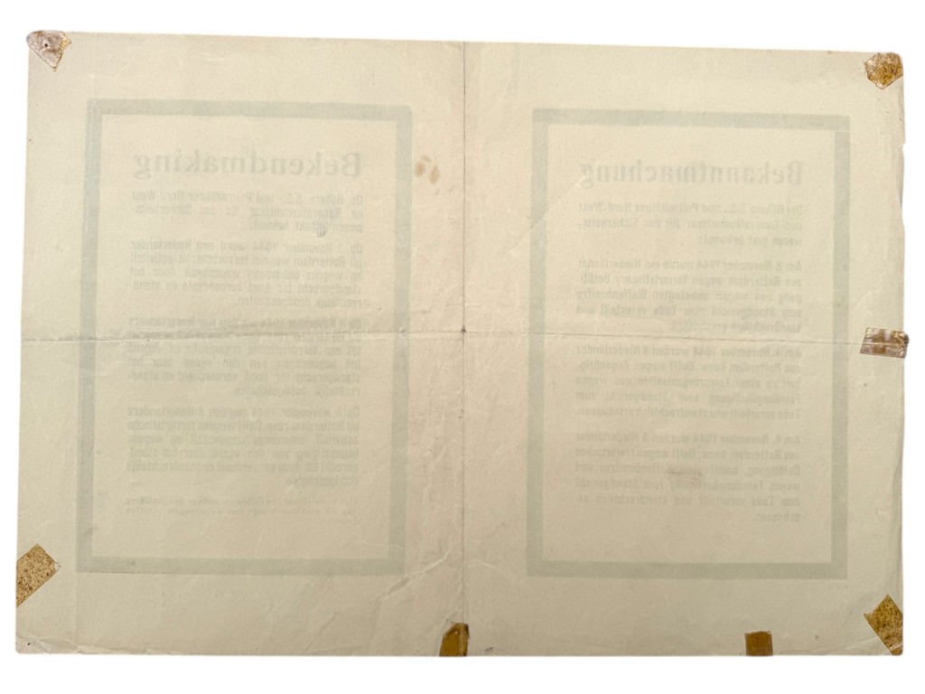 Deze Duitse bekendmaking uit november 1944, uitgegeven door de Höhere SS- und Polizeiführer Nord-West en de Generalkommissar für das Sicherheitswesen.