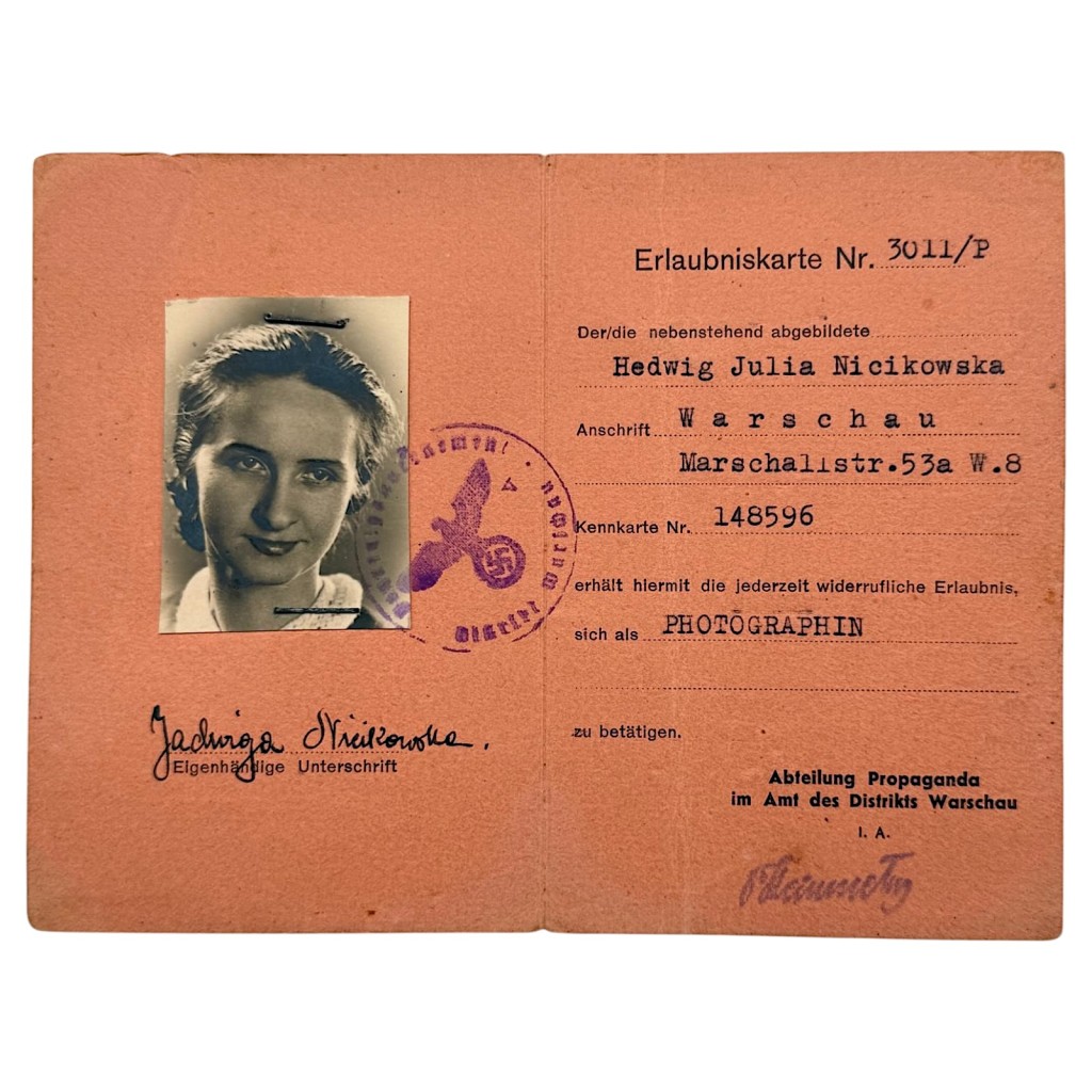 Deze originele zeldzame Erlaubniskarte (beroepsvergunning / legitimatiekaart) betreft een Duits bezettingsdocument uit de Tweede Wereldoorlog, afgegeven door de Abteilung Propaganda im Amt des Distrikts Warschau op naam van Hedwig Julia Nicikowska, wonende te Warschau, Marschallstr. 53a W.8, met vermelding van haar Kennkarte-nummer 148596.