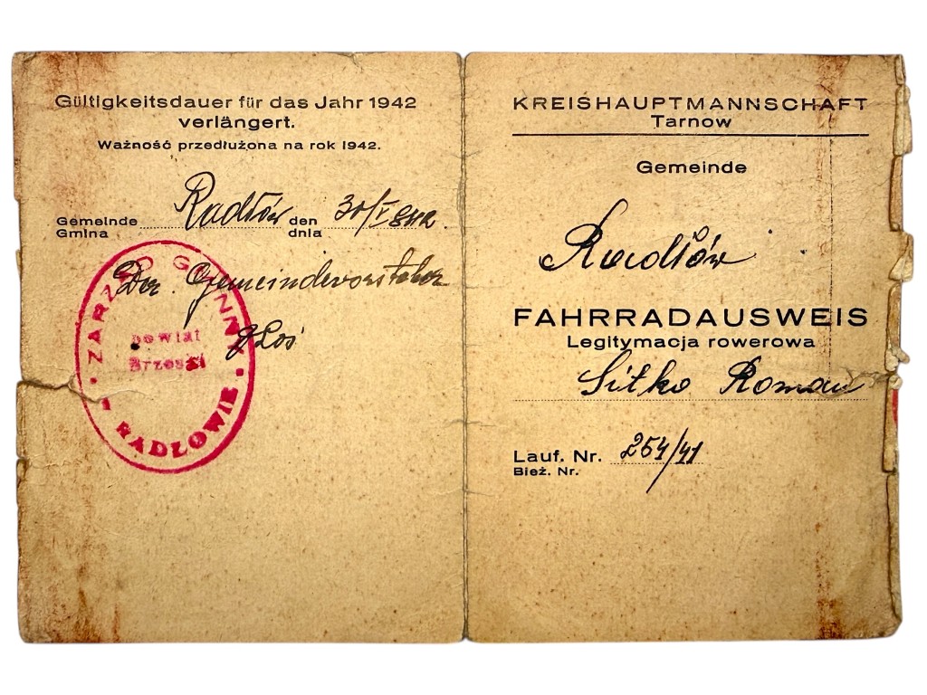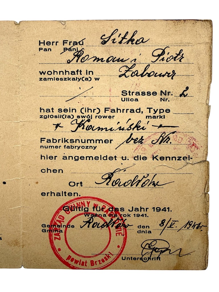 De kaart werd afgegeven op naam van Roman Sitko, woonachtig te Radłów (Straße Nr. 2) in de regio Powiat Brzeski, en registreert zijn fiets (merk Kamiński) officieel bij de gemeente Radłów. Het document vermeldt registratienummer 264/41 en bevat een originele pasfoto, handgeschreven gegevens en handtekening van de houder, evenals meerdere duidelijke gemeentelijke stempels, waaronder “Gemeinde Radłów – Powiat Brzeski”.