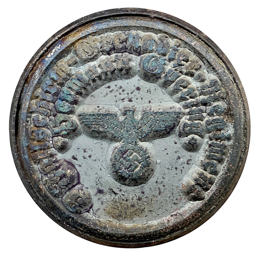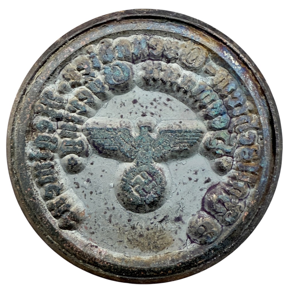 Het object verkeert in originele, gebruikte staat met duidelijke ouderdoms- en gebruikssporen. Ter verduidelijking is de foto van de onderzijde in spiegelbeeld weergegeven, zodat goed zichtbaar is welke tekst en afbeelding de stempelafdruk weergeeft. Een interessant verzamelobject voor de militaria of Tweede Wereldoorlog collectie!