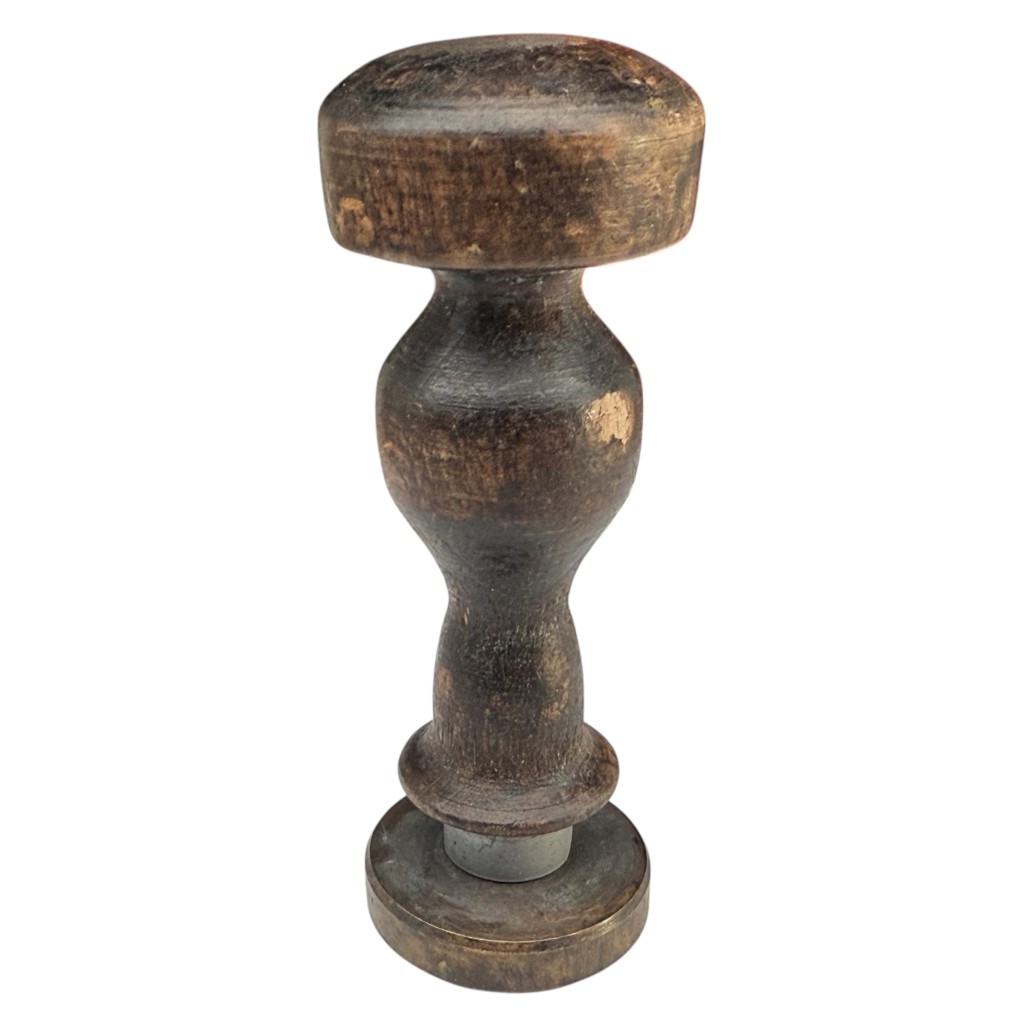 The item remains in original, used condition with clear signs of age and wear. For clarity, the photo of the underside is shown in mirror image, allowing the exact text and image of the stamp impression to be clearly visible.