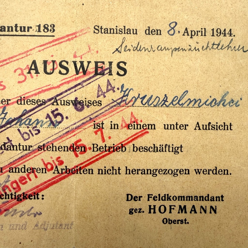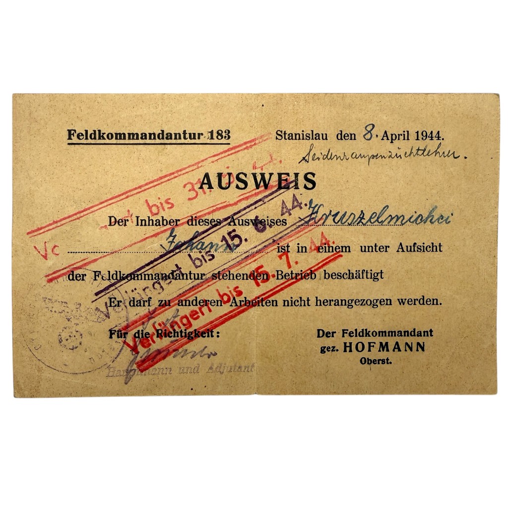 This original Ausweis is a German work and employment identification pass from 1944, issued by Feldkommandantur 183 in Stanislau on April 8, 1944.
