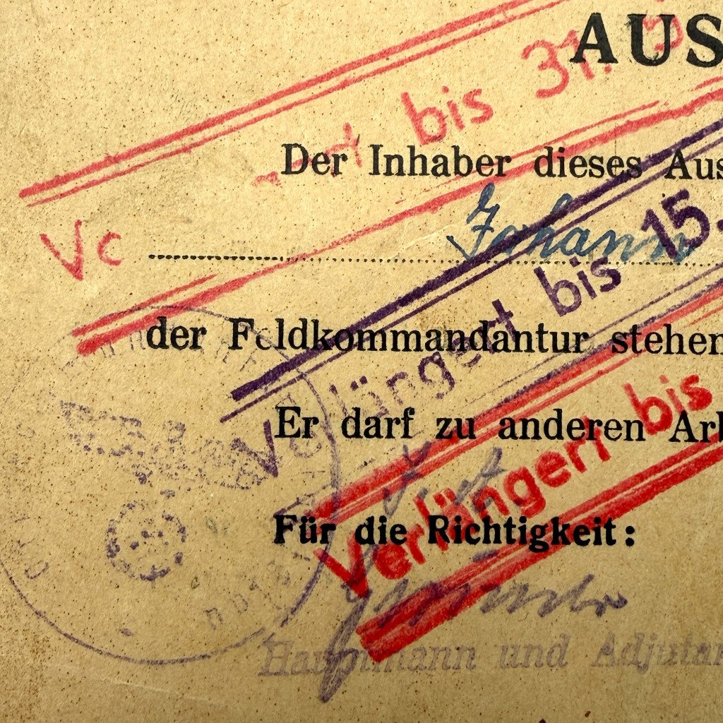De Ausweis verkeert in gebruikte conditie, passend bij intensief gebruik in oorlogstijd. Tijdens de Tweede Wereldoorlog stond Stanislau (het huidige Ivano-Frankivsk, Oekraïne) onder Duits militair bestuur binnen het Generalgouvernement, waar de Feldkommandantur toezicht hield op arbeid en economische activiteiten ten dienste van de Duitse oorlogsvoering.