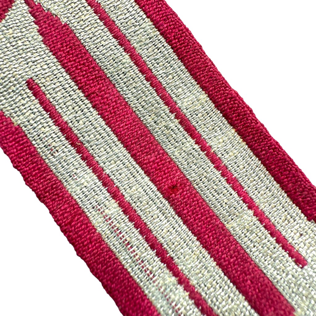 De kraagspiegel is vervaardigd uit karmozijnrode basisstof met ingeweven zilverkleurige strepen, typerend voor de rangonderscheiding binnen deze organisatie.