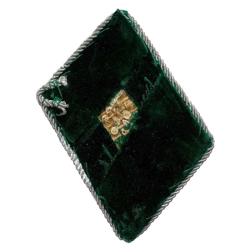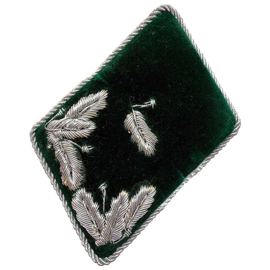 A collar tab from the German Forstverwaltung (forestry) dating from the Second World War, belonging to the rank of Revierförsteranwärter. The insignia is made of dark green wool felt and richly embroidered with silver-colored oak leaves, bordered with a silver twist cord for an officer-grade finish. The reverse side shows the authentic attachment construction. An interesting piece for any specialized collection of German WWII forestry and administrative insignia.