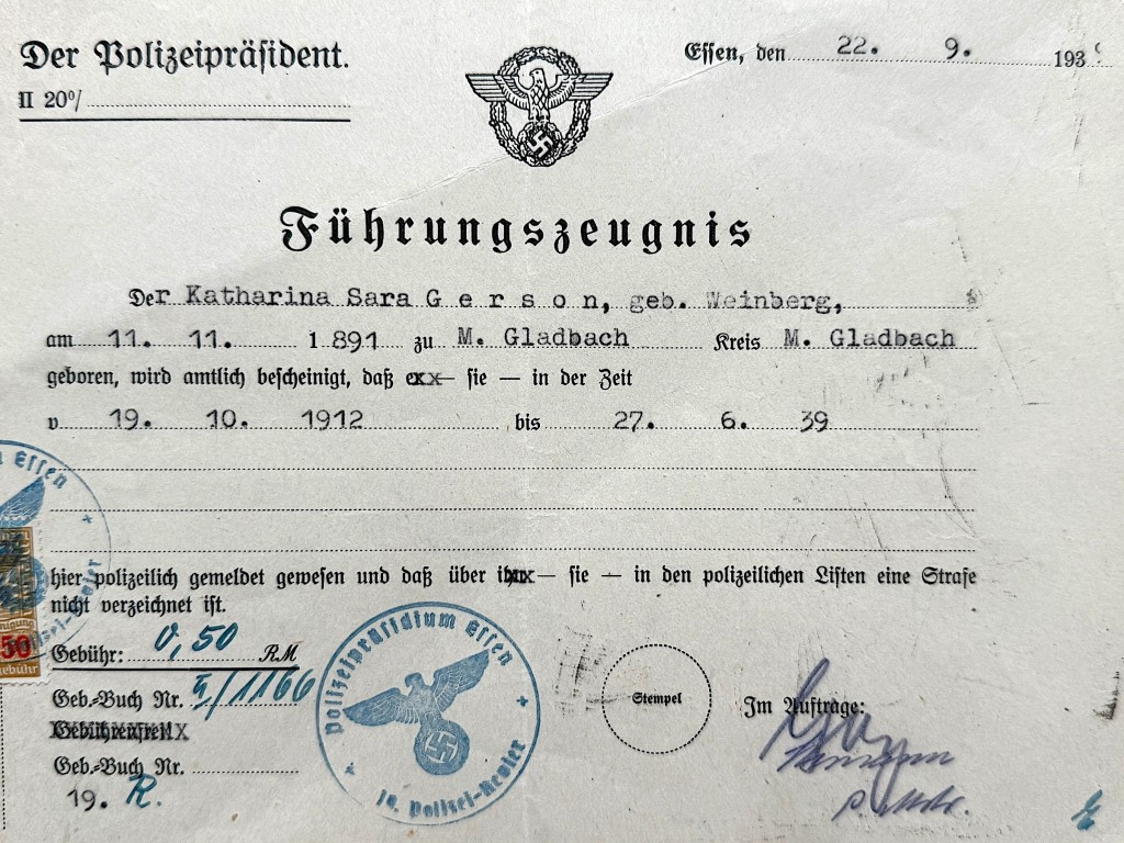 Het document werd verstrekt aan Katharina Sara Gerson, geboren in 1891 te Mönchengladbach, en bevestigt dat zij in de opgegeven periode niet met de politie in aanraking was gekomen.