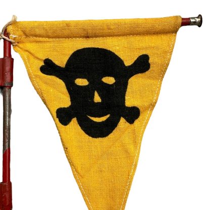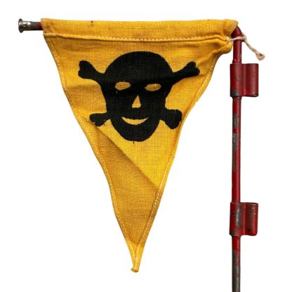 Deze Duitse gas identificatie vlag op stok is in goede conditie en voorzien van een rode metalen stok met een gele vlag met een zwarte doodskop.
