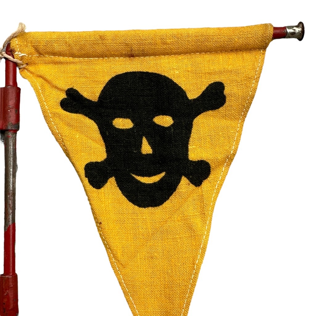 This German gas warning flag on stick is in good condition and features a red metal stick with a yellow flag with a black skull.