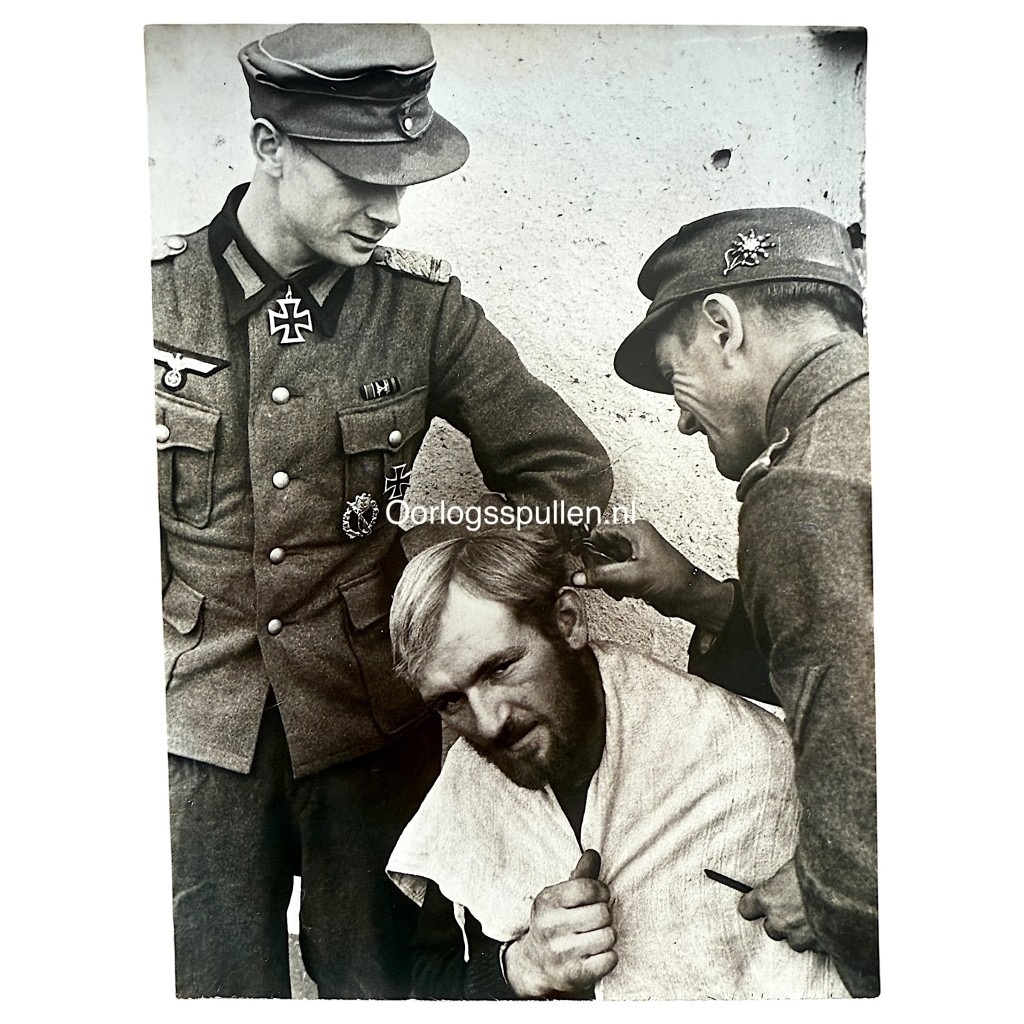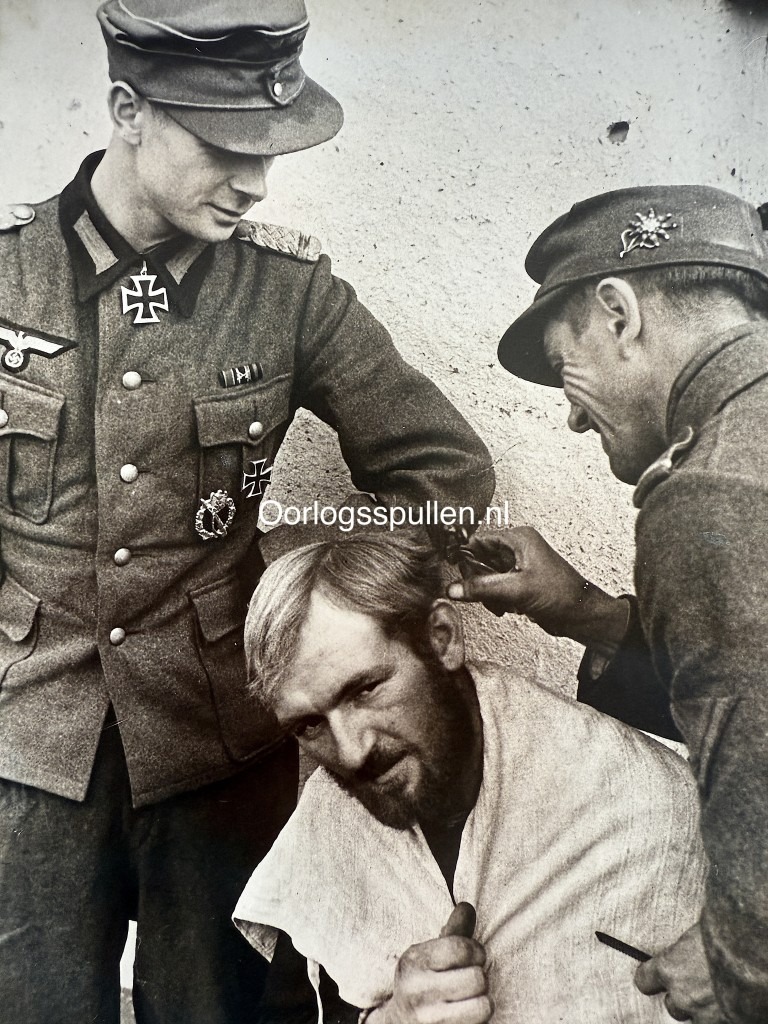 Deze Duitse foto is in goede conditie, dateert uit 1944 en daarop is de Gebirsjäger Ridderkruisdragen Major Grund op te zien zijn het knippen van één van zijn manschappen.