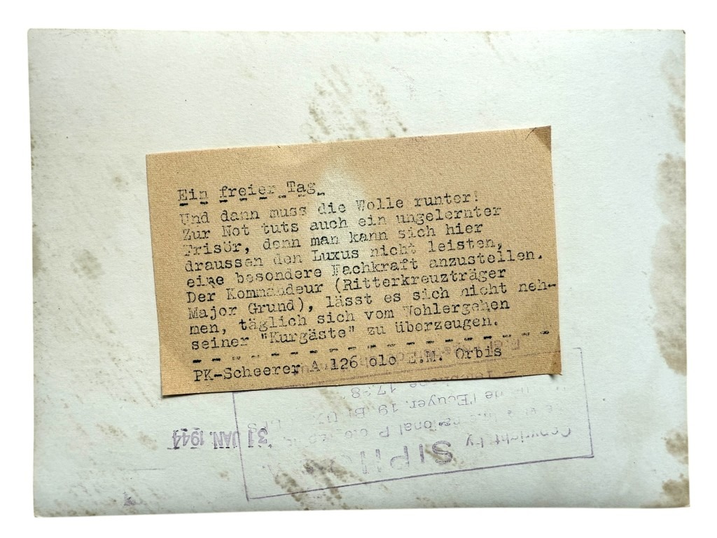 This German photograph is in good condition, dates from 1944, and shows Gebirsjäger Knight’s Cross recipient Major Grund during a haircut with his men.