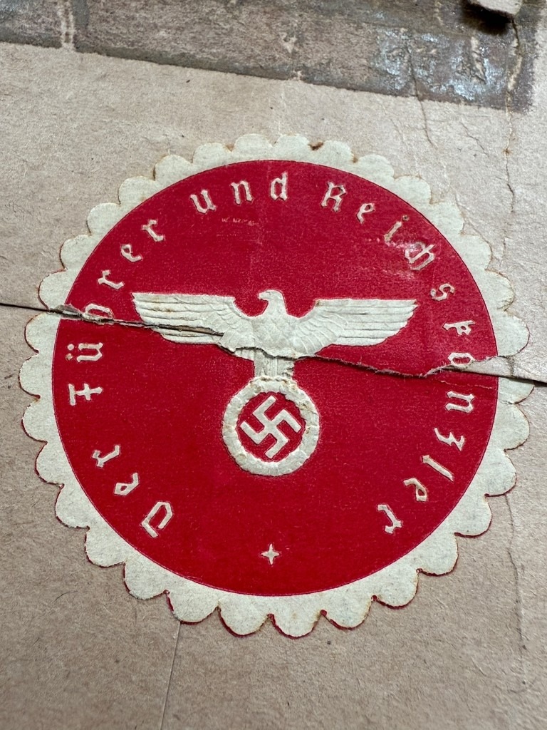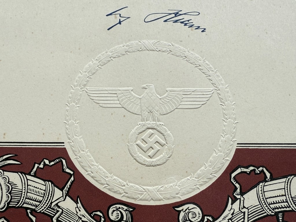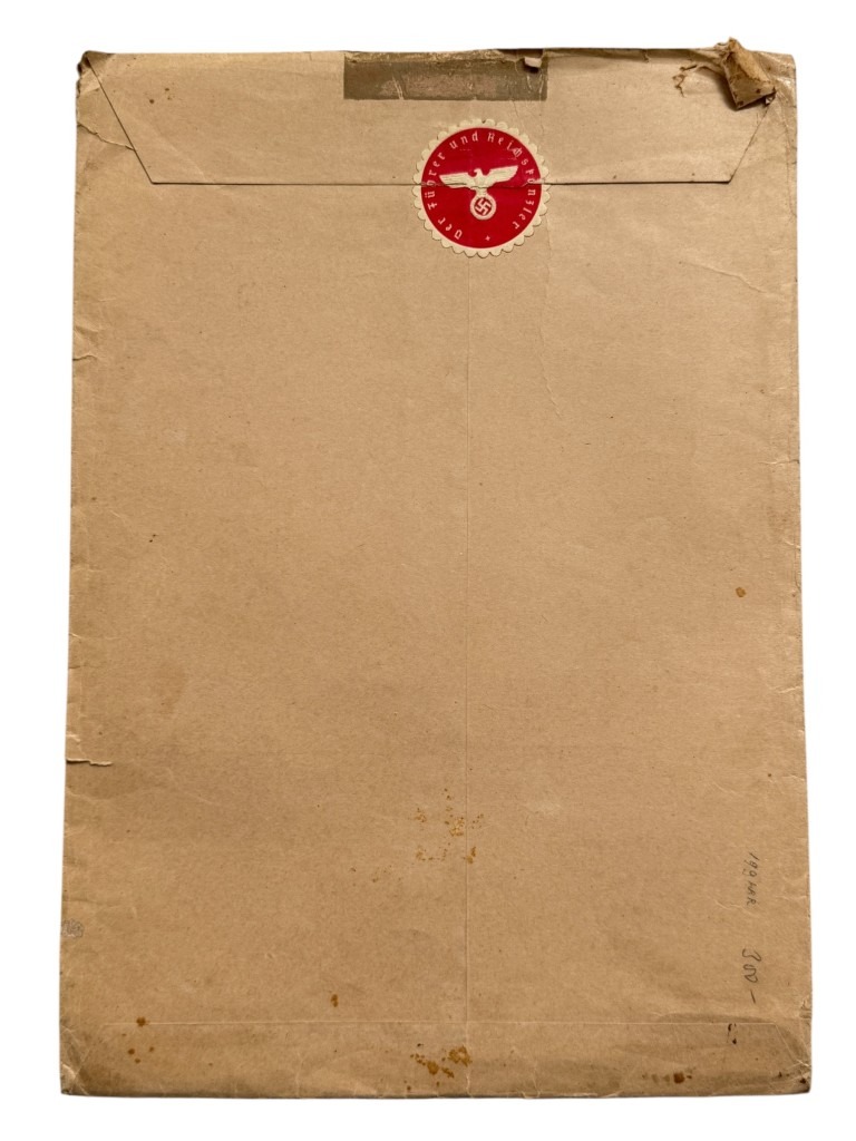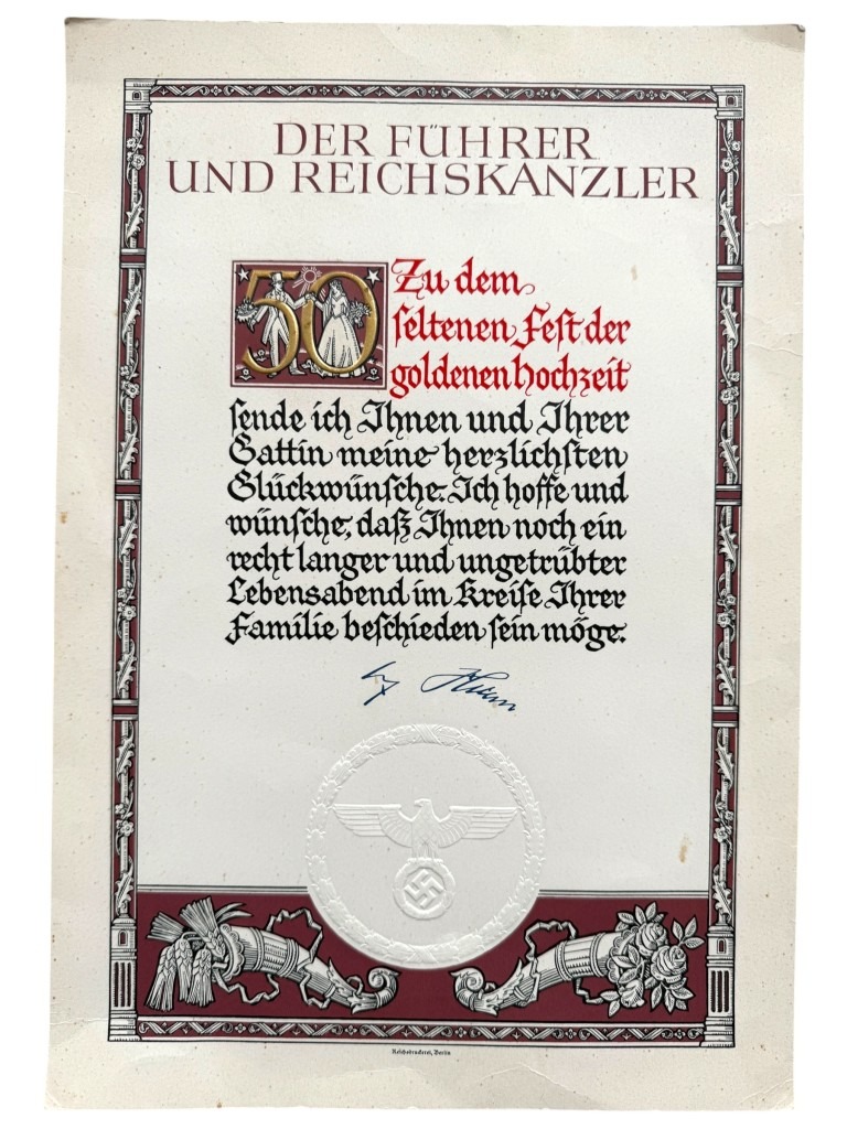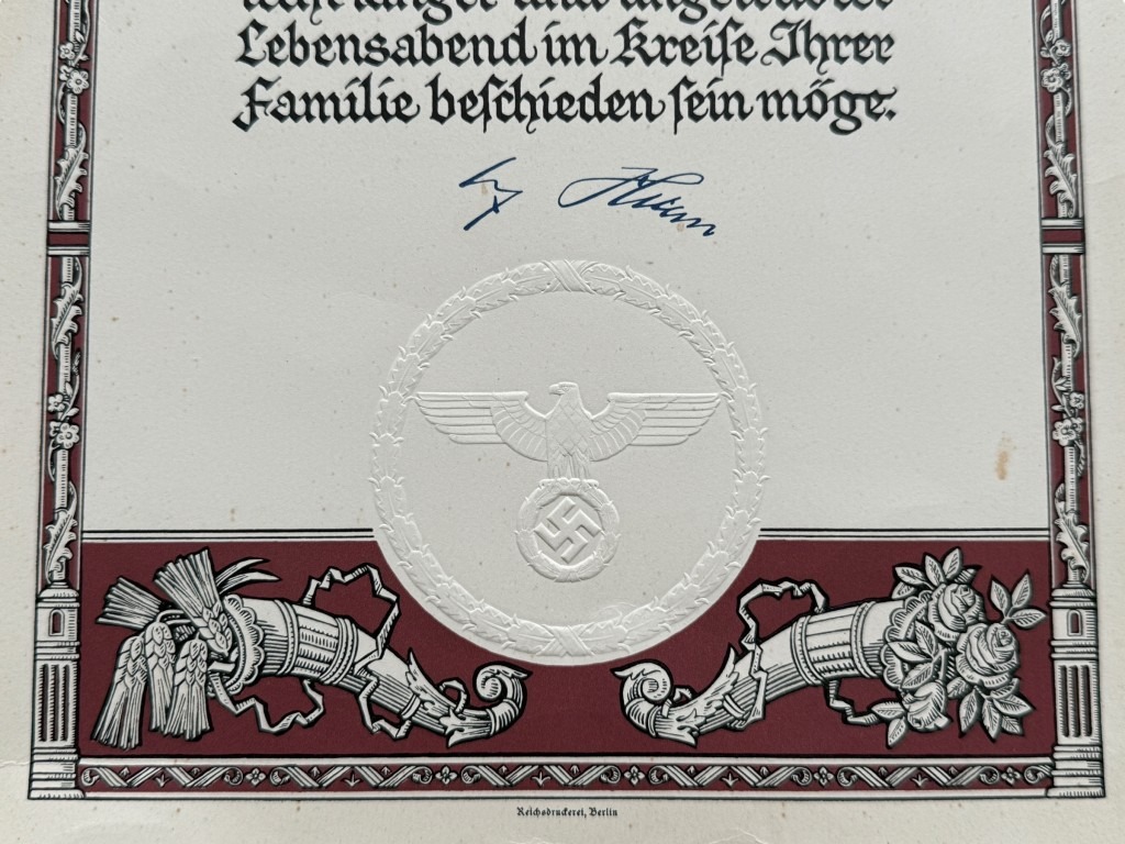 De set bevat een officiële felicitatie-urkunde namens de Führer en Rijkskanselier Adolf Hitler, voorzien van rijk gedecoreerde rand, NSDAP-adelaar met hakenkruis in reliëf en gotische drukletters.
