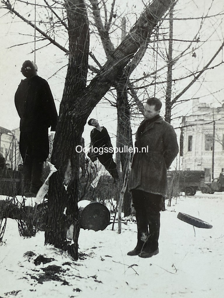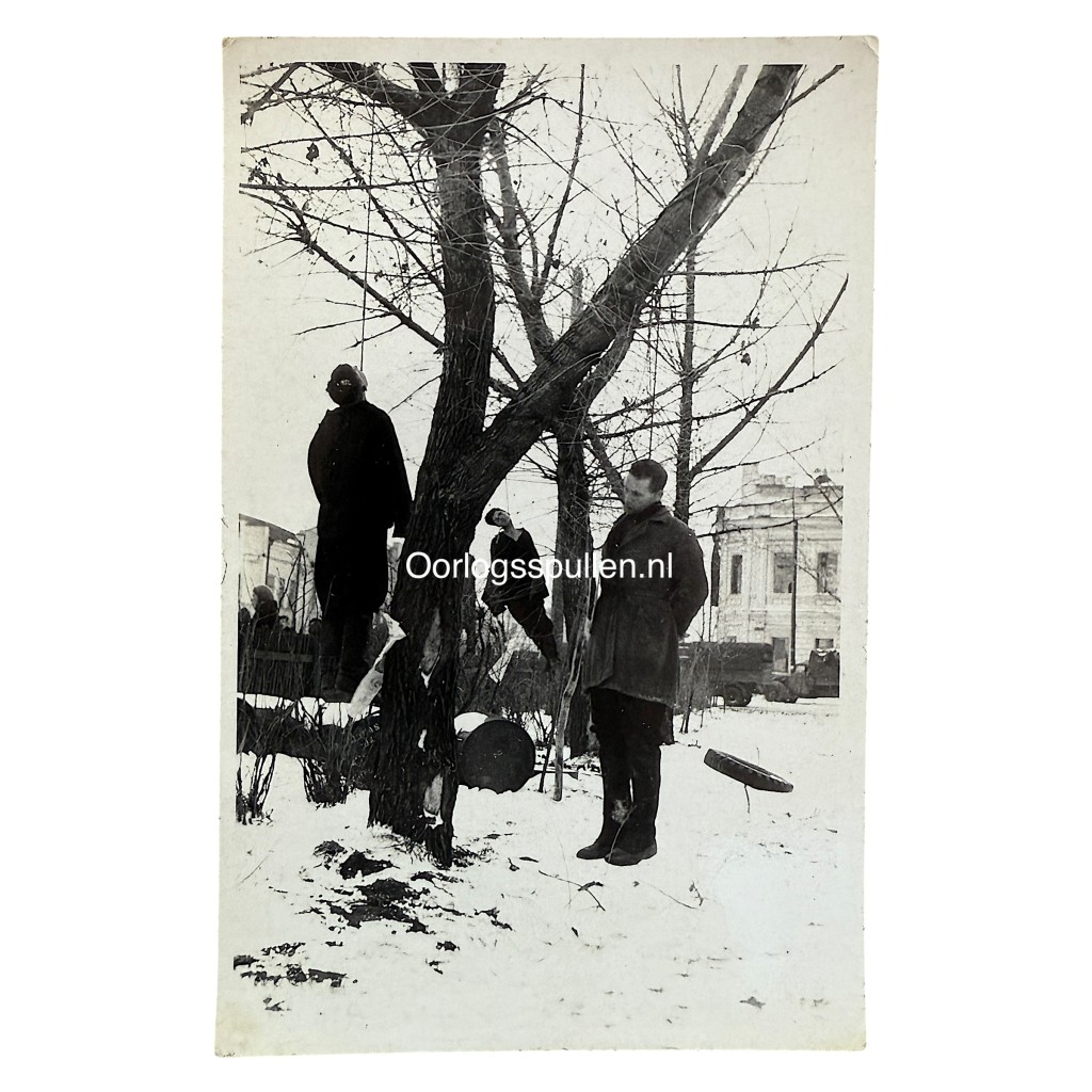 This historically significant German photograph is in good condition and shows three partisans hanged on the Eastern Front.