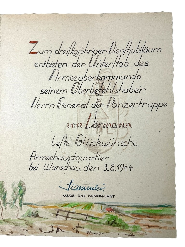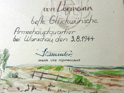 Original WWII German hand painted certificate from General der Panzertruppe Nikolaus von Vormann during the Warsaw Uprising