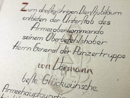 This hand painted German certificate is in good condition and comes from the possession of General der Panzertruppe Nikolaus von Vormann.