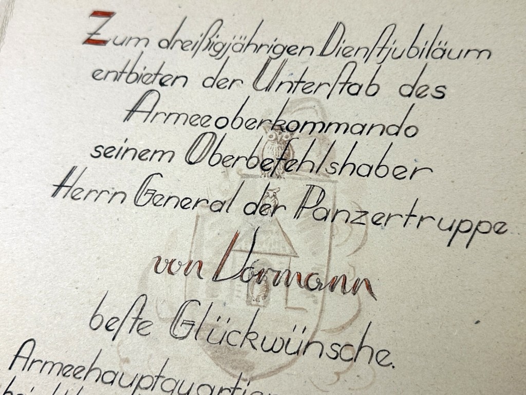Deze handgeschilderde Duitse oorkonde is in goede conditie en komt uit het bezit van General der Panzertruppe Nikolaus von Vormann.